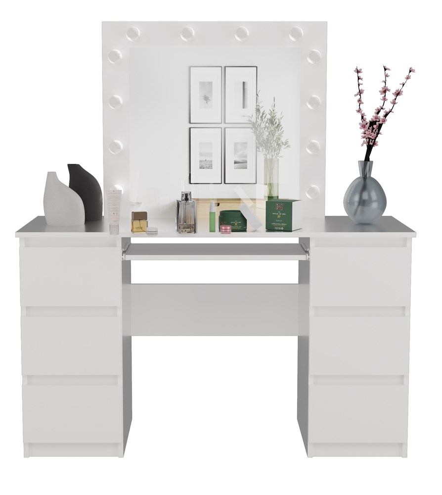 Lustro o wymiarach szerokości 80 cm i wysokości 70 cm będące integralną częścią toaletki, nie tylko dodaje uroku, ale również zostało wyposażone w energooszczędne oświetlenie LED. To oświetlenie zapewnia idealne warunki do precyzyjnego makijażu i pielęgnacji twarzy, tworząc przy tym atmosferę sprzyjającą relaksowi i dobremu samopoczuciu. Dedykowane oświetlenie LED dostarczane jest razem z kompletnym zestawem, zawierającym żarówkę, okablowanie, zasilacz i włącznik.