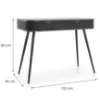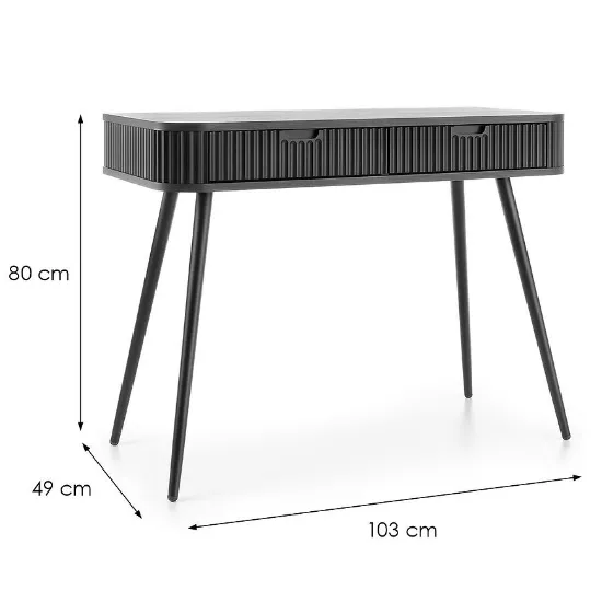 Toaletka ma wymiary 103 cm szerokości, 80 cm wysokości i 49 cm głębokości, co sprawia, że świetnie sprawdzi się zarówno w sypialni, jak i garderobie. Konstrukcja frontów wykonana została z trwałej płyty MDF, natomiast korpus z odpornej na uszkodzenia płyty wiórowej laminowanej, co zapewnia stabilność i wytrzymałość na lata.