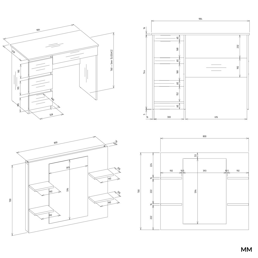 Toaletka ma 98 cm szerokości, 51 cm głębokości i 146 cm wysokości. Została zaprojektowana tak, aby dopasować się do większości wnętrz – zarówno przestronnych sypialni, jak i mniejszych garderób. Trzy wyższe szuflady po lewej stronie (24 × 38 × 11,5 cm) oraz szeroka szuflada podblatowa po prawej (56 × 28 × 8 cm) zapewniają wygodną organizację codziennych akcesoriów.