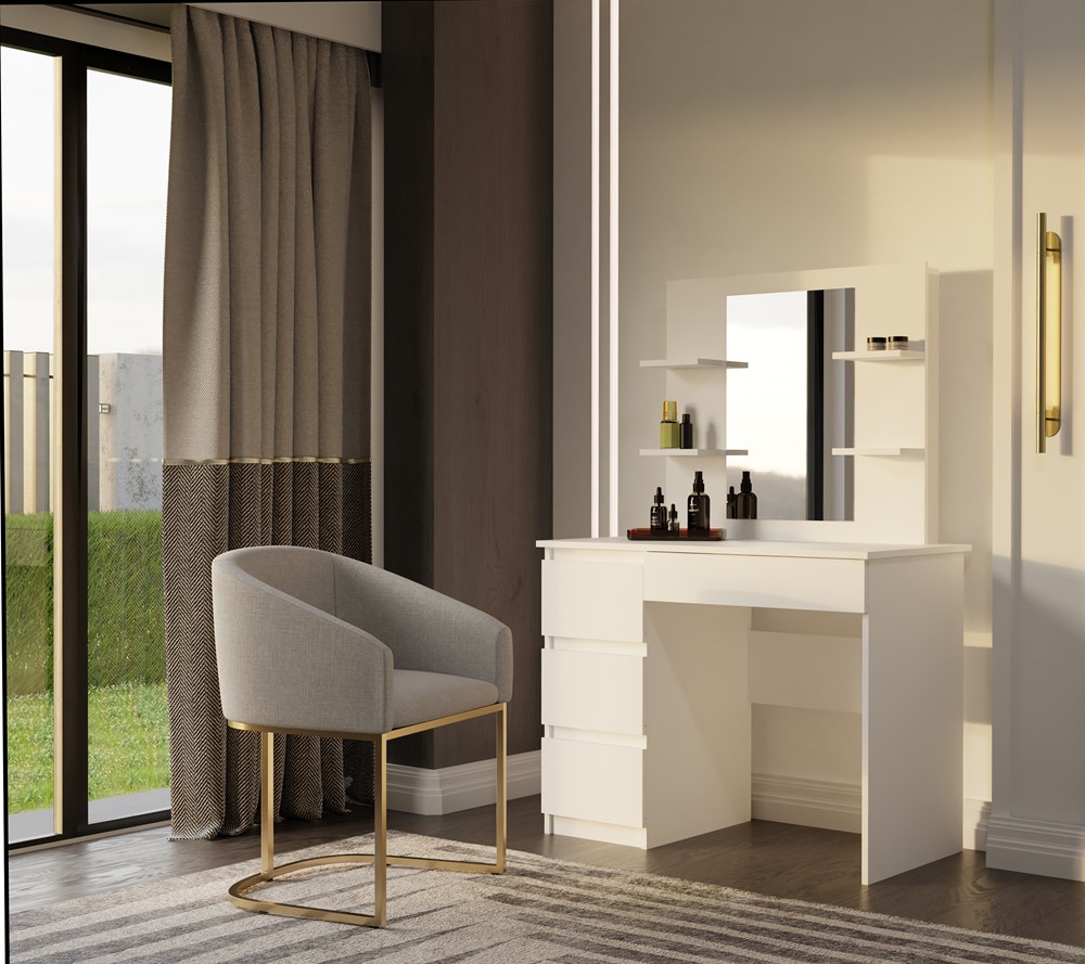 Wersja lewa wyróżnia się rozmieszczeniem szuflad po lewej stronie. Mebel wyposażono w trzy wyższe szuflady, które świetnie sprawdzą się jako miejsce na kosmetyki, akcesoria do włosów, drobną elektronikę czy elementy garderoby. Po prawej stronie, tuż pod blatem, znajduje się jedna szeroka i niższa szuflada – idealna na większe przedmioty, dokumenty, palety cieni lub urządzenia kosmetyczne.
