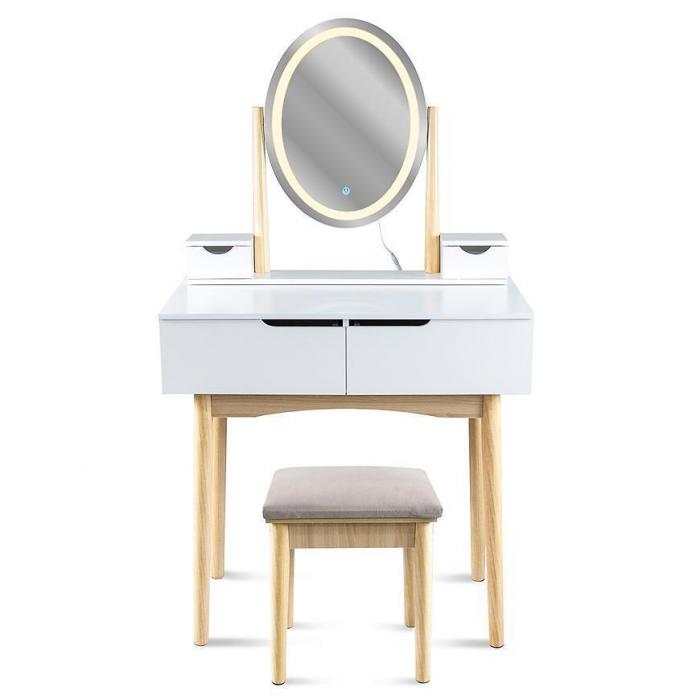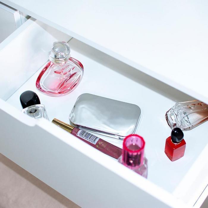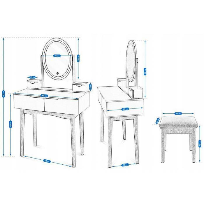 Toaletka w nowoczesnym stylu z lustrem LED i taboretem, to mebel który wpasuje się w klasyczne i nowoczesne wnętrza. Wykonana z płyty MDF, posiada dużo miejsca do przechowywanie niezbędnych przedmiotów.