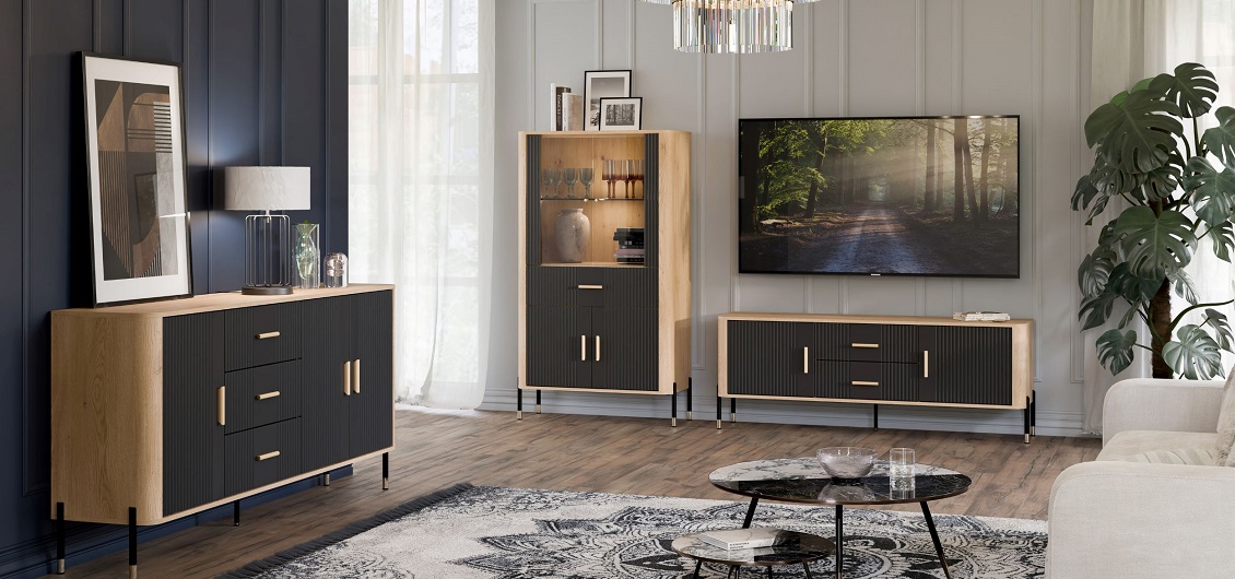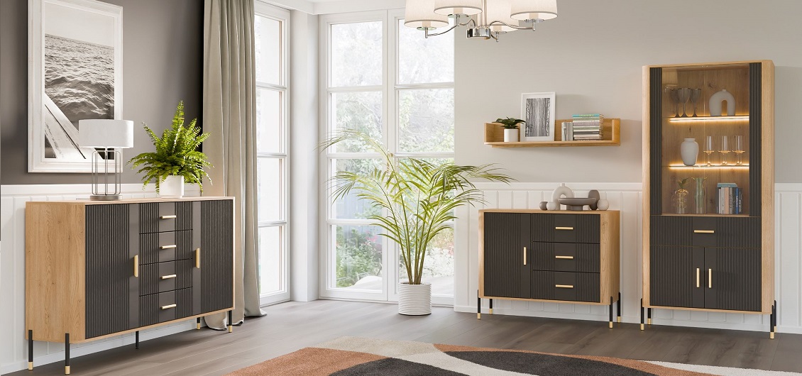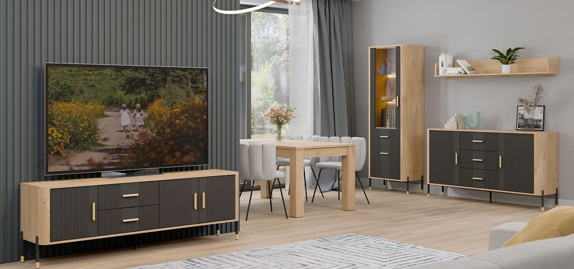 Fronty wykonano z płyty MDF, a korpus z płyty wiórowej laminowanej w kolorze dąb cremona torro, co gwarantuje wytrzymałość i odporność na codzienne użytkowanie. Matowe wykończenie frontów podkreśla nowoczesny charakter mebla i ułatwia utrzymanie go w czystości.