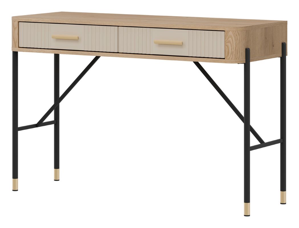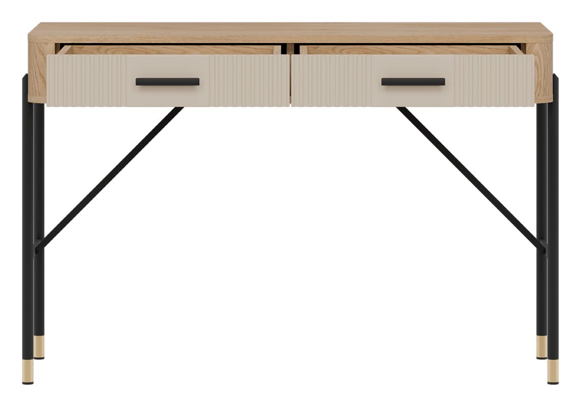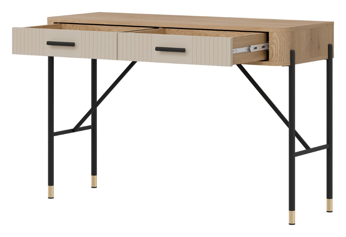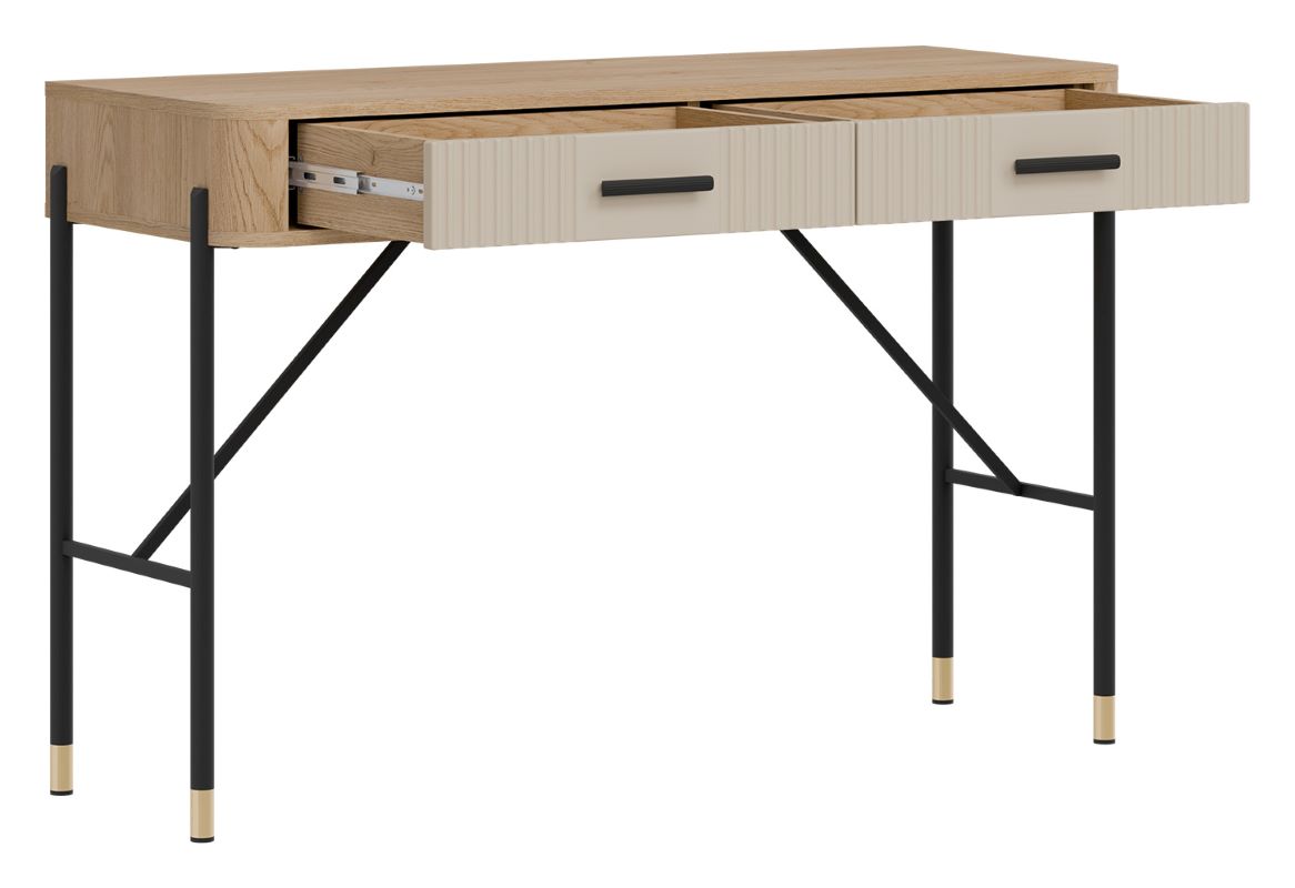 Model Dante DT19 kaszmir wyposażony jest w dwie pojemne szuflady, które zapewniają wygodne przechowywanie kosmetyków, biżuterii, dokumentów czy drobiazgów. Dzięki temu blat toaletki zawsze pozostaje uporządkowany i gotowy do użytku.