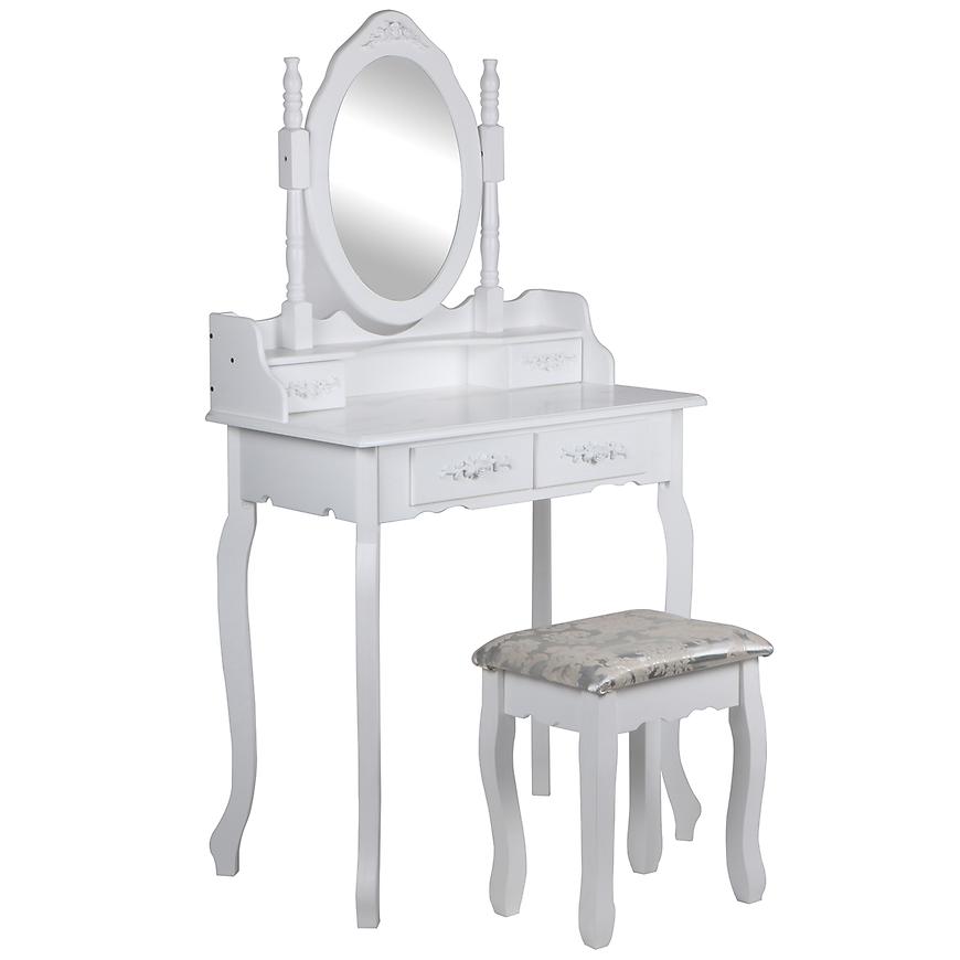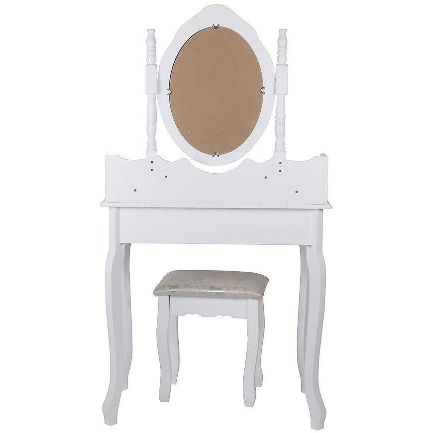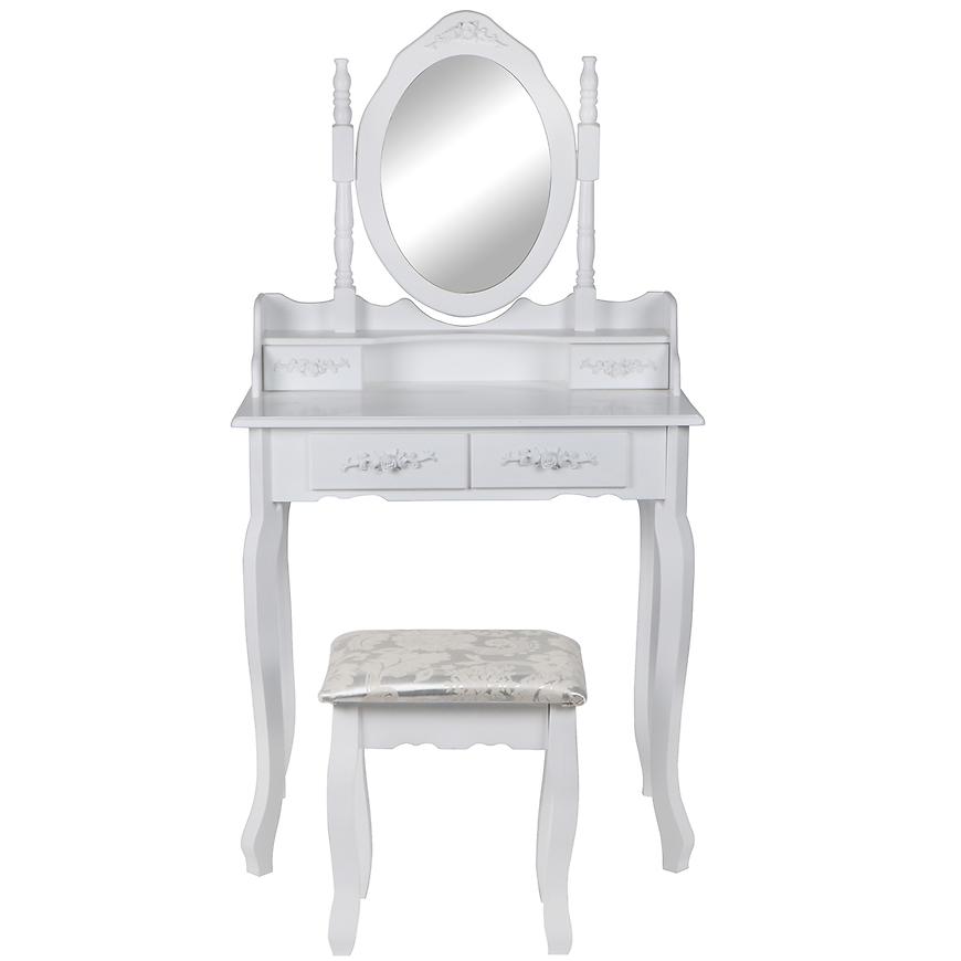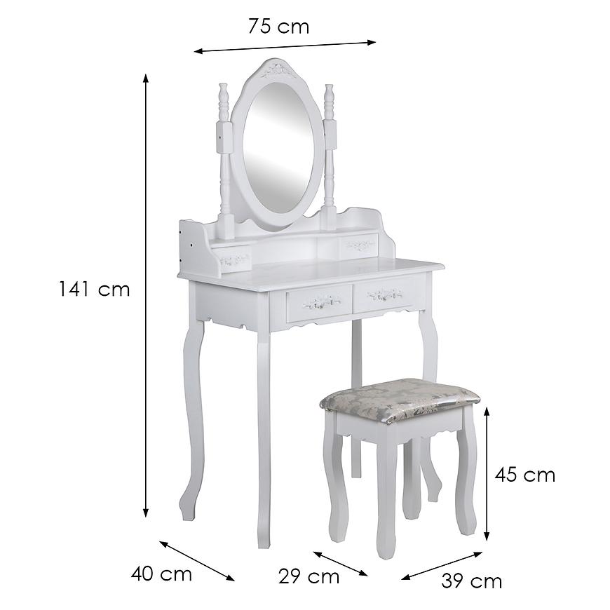 W komplecie znajduje się lustro, które ułatwia wykonywanie codziennych czynności pielęgnacyjnych, oraz taboret w dopasowanym białym kolorze. Ergonomiczna wysokość taboretu zapewnia wygodę podczas użytkowania toaletki.