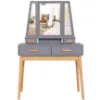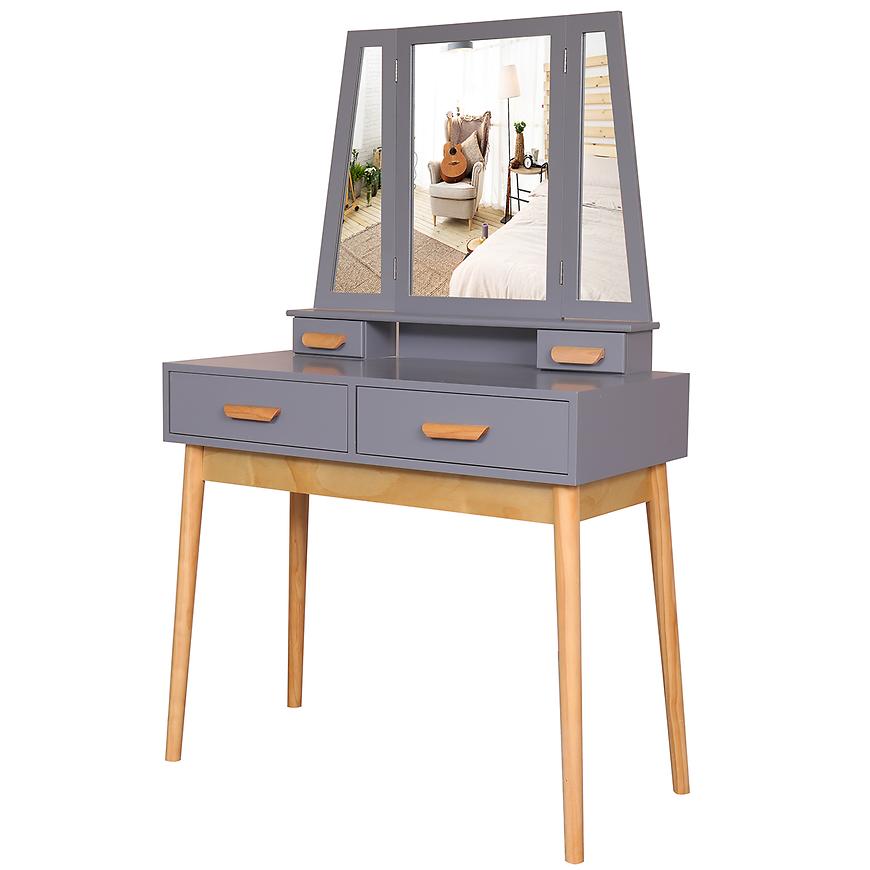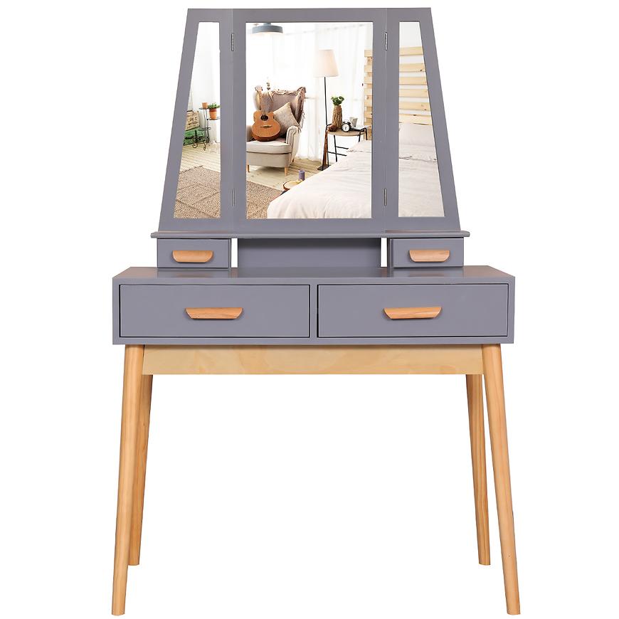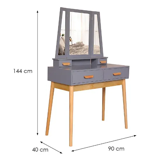 Połączenie szarości z naturalnym drewnem nadaje meblowi harmonijny i nowoczesny wygląd. Prosta forma toaletki pozwala wkomponować ją w różne aranżacje wnętrz, wprowadzając elegancję, styl i spójność do sypialni.