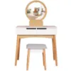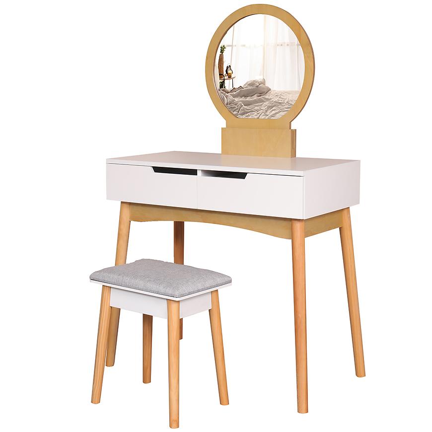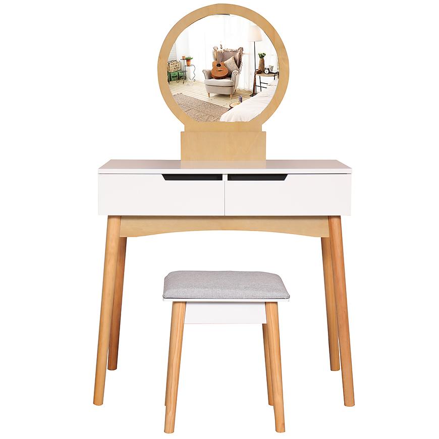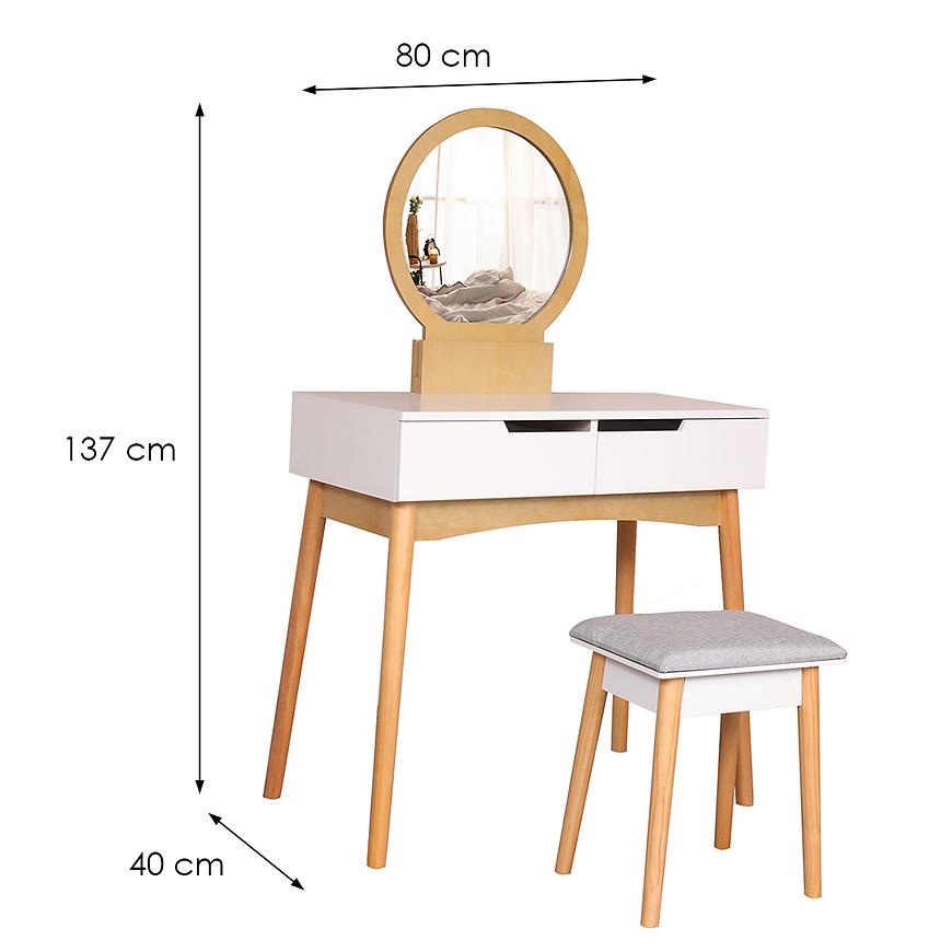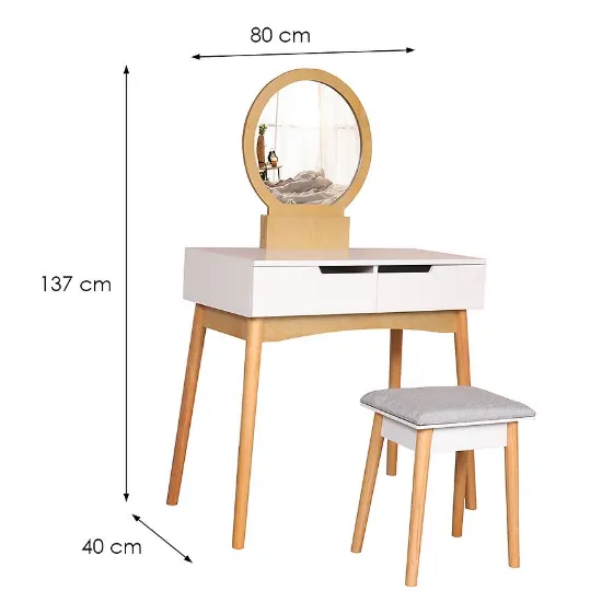 Toaletka z taboretem Sylvia 017 9515 biała/naturalna łączy nowoczesny design z praktycznym zastosowaniem. Dwie szuflady i ergonomiczny taboret pozwalają na komfortowe przygotowania każdego dnia. Matowe wykończenie i uniwersalna kolorystyka czynią z niej elegancki element sypialni, który dopasowuje się do wielu aranżacji wnętrz.