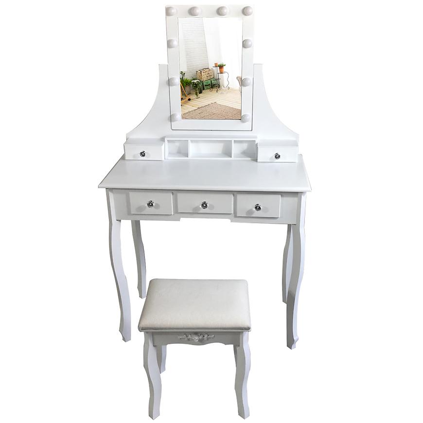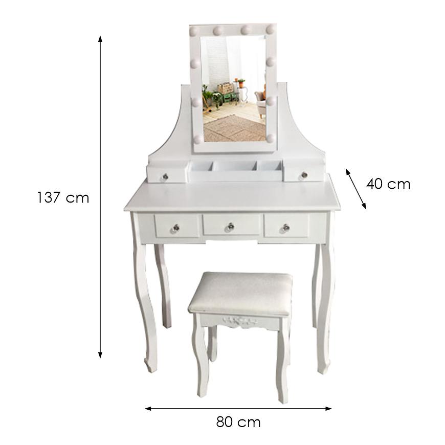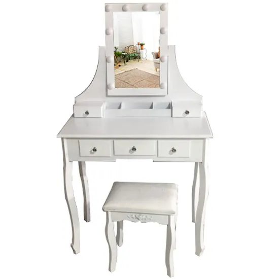 Toaletka wyposażona jest w pięć pojemnych szuflad, które umożliwiają wygodne przechowywanie kosmetyków, akcesoriów czy biżuterii, utrzymując porządek w codziennej rutynie pielęgnacyjnej. Do kompletu dołączony jest praktyczny taboret, który zapewnia komfort podczas codziennego użytkowania. Klasyczny styl toaletki Sylvia sprawia, że jest ona nie tylko praktycznym meblem, ale także eleganckim elementem dekoracyjnym, który wprowadza do wnętrza subtelną atmosferę szyku i harmonii