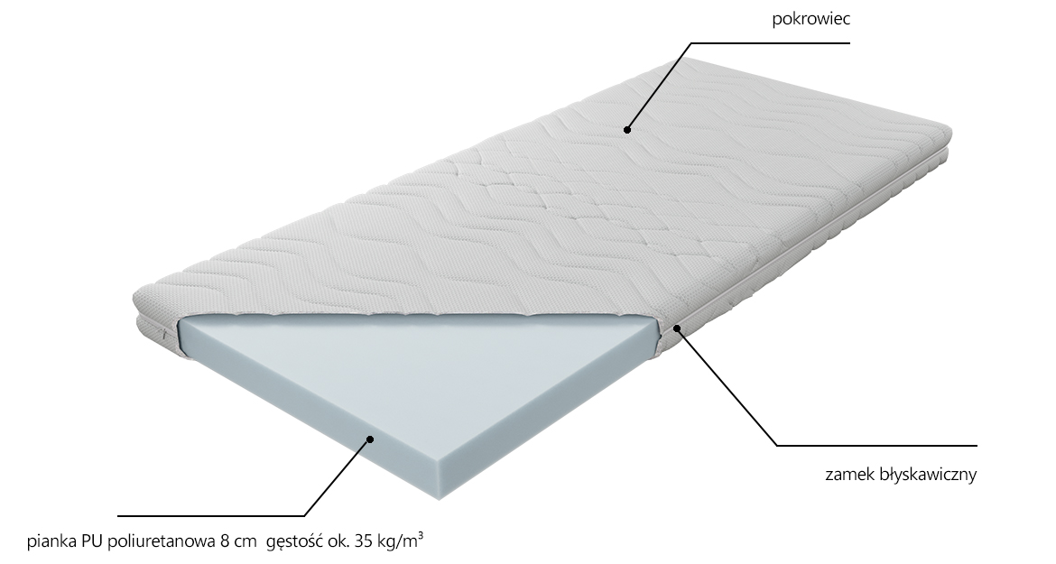 Topper został wyposażony w pokrowiec wykonany z wysokiej jakości dzianiny materacowej, który jest przyjemny w dotyku i dobrze przepuszcza powietrze. Zastosowany zamek rozdzielczy umożliwia szybkie zdejmowanie pokrowca, co znacząco ułatwia utrzymanie czystości.
