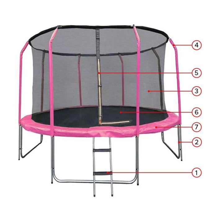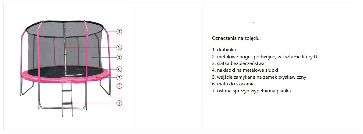 drabinka, metalowe nogi - podwójne, w kształcie litery U, siatka bezpieczeństwa, nakładki na metalowe słupki, wejście zamykane na zamek błyskawiczny, mata do skakania, osłona sprężyn wypełniona pianką