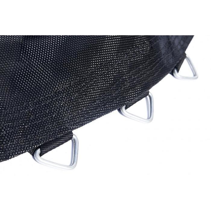 Konstrukcja trampoliny jest bardzo stabilna i wytrzymała - wykonana z dwustronnie ocynkowanych rur stalowych o średnicy 38mm i grubości 1,5mm. Dodatkowo została wzmocniona podwójnymi nóżkami w kształcie litery U. Mata do skakania jest wodoodporna i wytrzymała - została wykonana z polipropylenu. Wejście do trampoliny zamykane jest na zamek - zaleca się zamykanie trampoliny przy każdorazowym korzystaniu z niej. Aby zagwarantować bezpieczeństwo zalca się użycie podczas montażu kotwic mocujących.