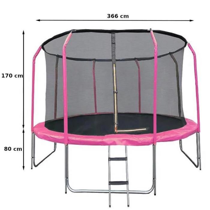 Trampolina o średnicy 366cm to świetny pomysł do sprawienia dzieciom frajdy, jest to idealna motywacja dla nas do spędzenia aktywnie wolnego czasu. Trampolina przeznaczona jest dla dorosłych oraz dla dzieci, ważne jednak by obciążenie nie przekraczało 150kg.