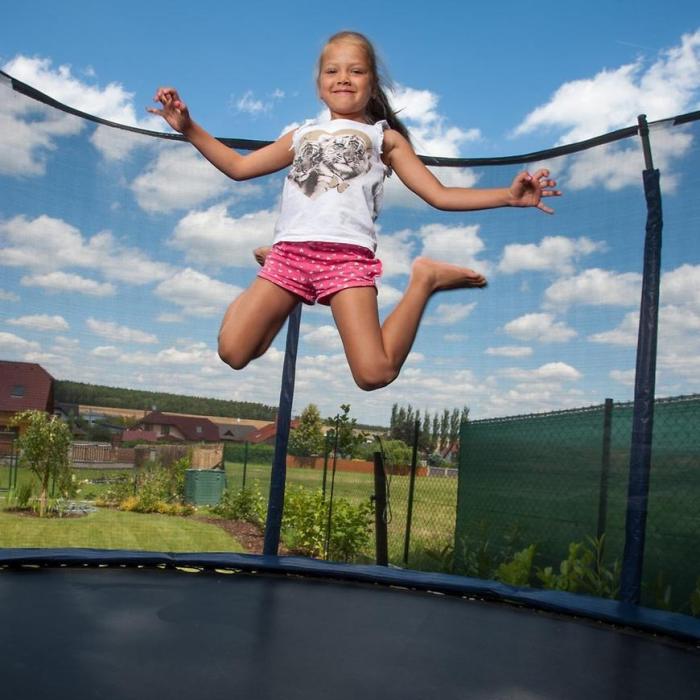 Konstrukcja trampoliny jest bardzo stabilna i wytrzymała - wykonana z ocynkowanych rur stalowych. Dodatkowo została wzmocniona trzema nóżkami w kształcie litery U. Mata do skakania jest wytrzymała - została wykonana z polipropylenu, a powierzchnia jest nieścierająca i posiada ochronę UV co zapewni długą żywotność. Wejście do trampoliny zamykane jest na zamek i klamrę - zaleca się zamykanie trampoliny przy każdorazowym korzystaniu z niej.