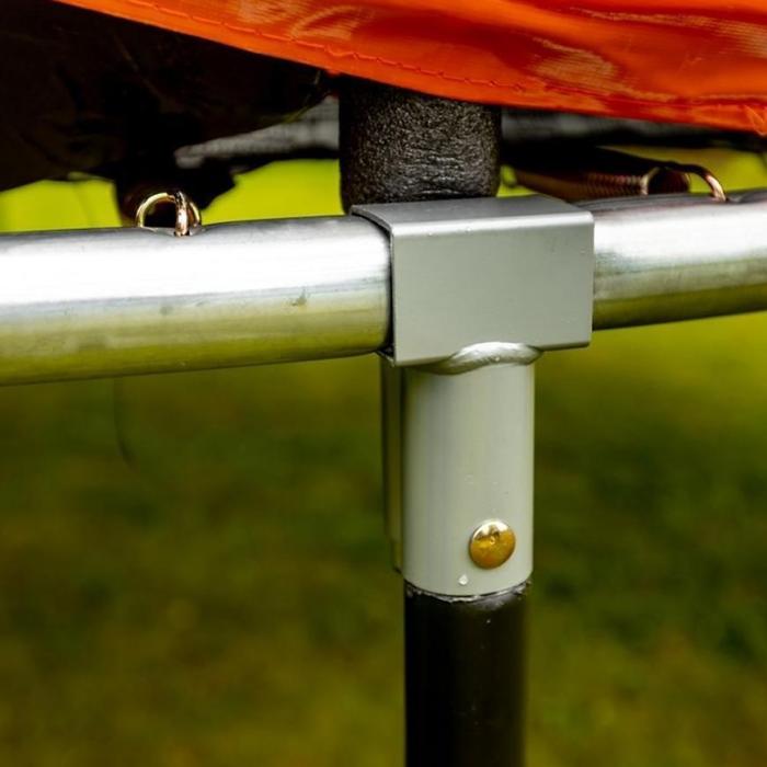 Konstrukcja trampoliny jest bardzo stabilna i wytrzymała - została wzmocniona przez większą liczbę nóg w kształcie litery U. Dodatkowo bezpieczeństwo zapewnią wzmocnione osłony sprężyn i nowa technologia połączeń T. Wygięte pręty podtrzymują wewnętrzną siatkę ochronną, a wzmocniona górna obręcz powoduje, że siatka jest naprężona. Materiał, który został użyty do powierzchni skakania jest nieścierny i wytrzymały, dzięki czemu ma długą żywotność. Trampolina charakteryzuje się bezpieczeństwem, dzięki czemu jest niezawodna.