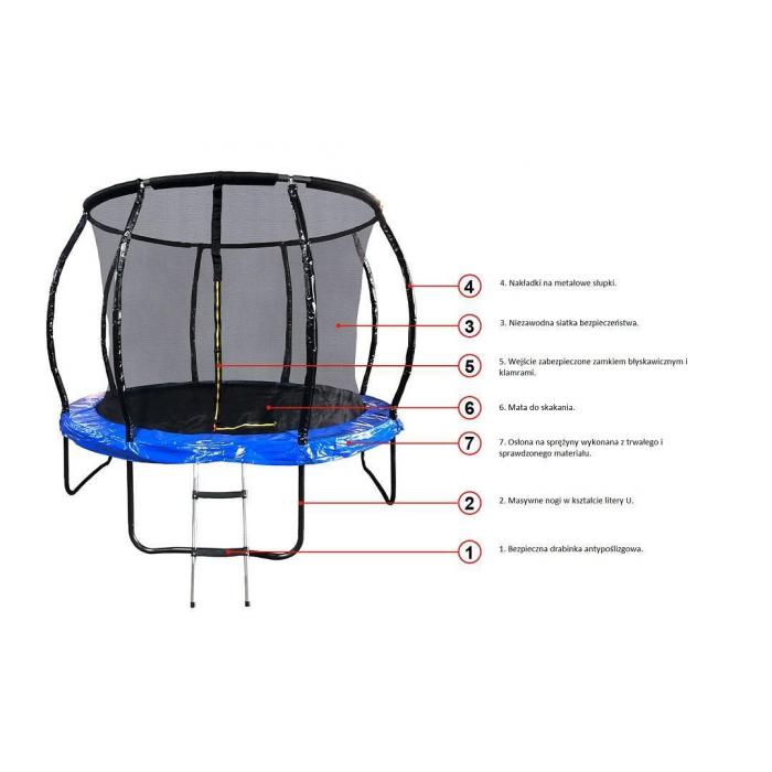 Konstrukcja trampoliny jest bardzo stabilna i wytrzymała - wykonana z dwustronnie ocynkowanych rur stalowych o średnicy 38mm i grubości 1,5mm. Dodatkowo została wzmocniona nóżkami w kształcie litery U. Mata do skakania jest wodoodporna i wytrzymała - została wykonana z polipropylenu. Wejście trampoliny zostało zabezpieczone zamkiem oraz klamrą, co zapewni bezpieczeństwo podczas użytkowania - zaleca się zamykanie trampoliny przy każdorazowym korzystaniu z niej. Siatka została zamontowana na zewnętrznych prętach, które zostały połączone w górnej części stalową obręczą i zabezpieczone ochronnymi rękawami piankowymi. Stalowe sprężyny zostały umieszczone poza powierzchnią odbijającą i dodatkowo ukryte pod osłoną bezpieczeństwa z piankowym wypełnieniem (PE).