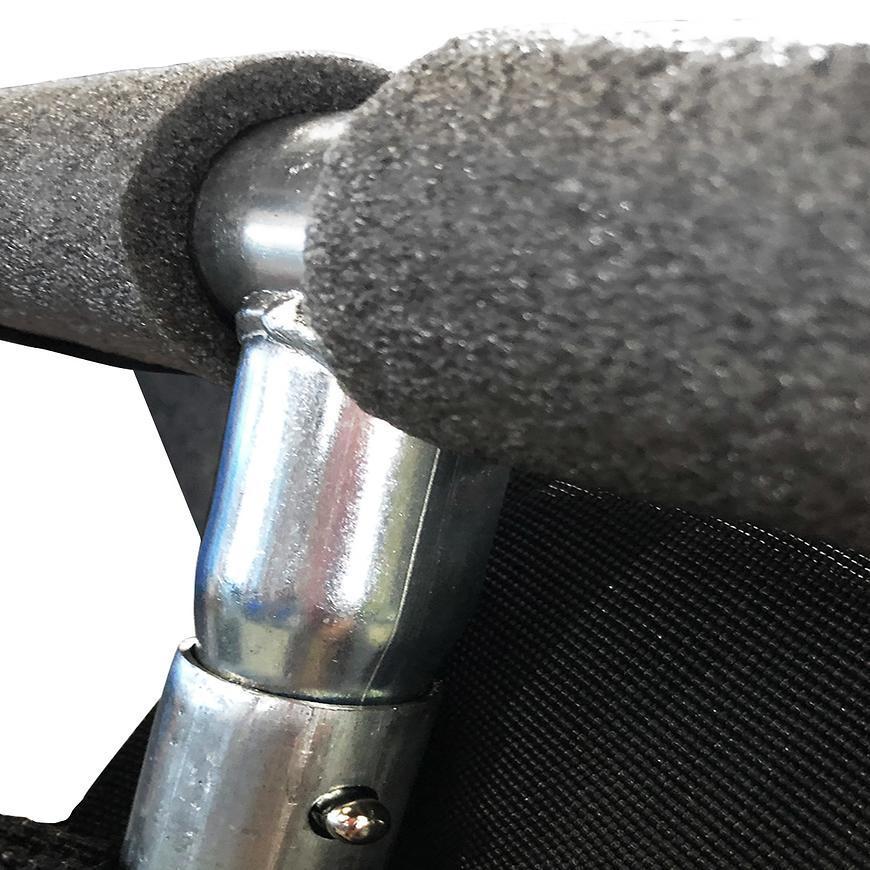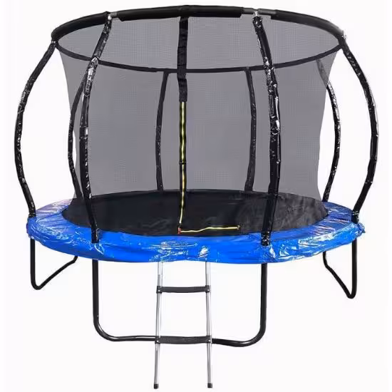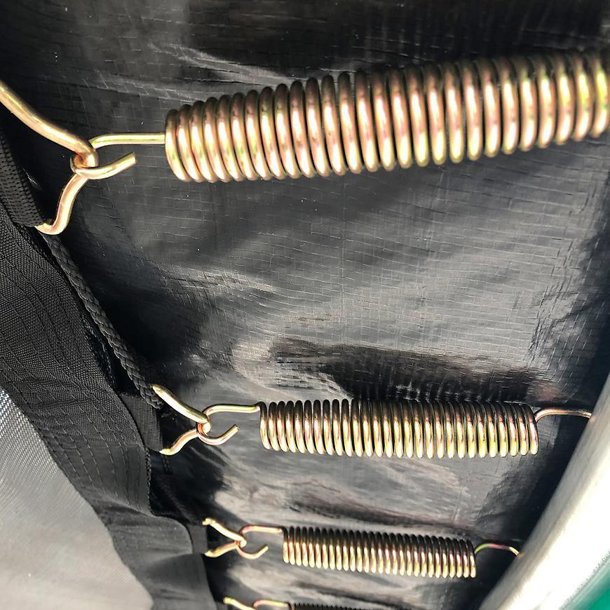 Konstrukcja trampoliny jest bardzo stabilna i wytrzymała - wykonana z dwustronnie ocynkowanych rur stalowych o średnicy 38mm i grubości 1,5mm. Dodatkowo została wzmocniona nóżkami w kształcie litery U. Mata do skakania jest wodoodporna i wytrzymała - została wykonana z polipropylenu. Wejście trampoliny zostało zabezpieczone zamkiem oraz klamrą, co zapewni bezpieczeństwo podczas użytkowania - zaleca się zamykanie trampoliny przy każdorazowym korzystaniu z niej. Siatka została zamontowana na zewnętrznych prętach, które zostały połączone w górnej części stalową obręczą i zabezpieczone ochronnymi rękawami piankowymi. Stalowe sprężyny zostały umieszczone poza powierzchnią odbijającą i dodatkowo ukryte pod osłoną bezpieczeństwa z piankowym wypełnieniem (PE).