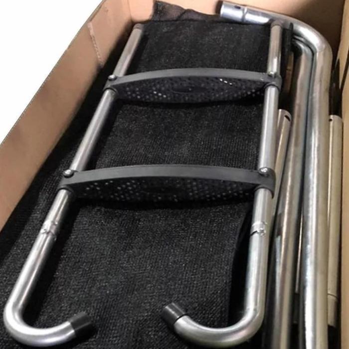 drabinka, metalowe nogi - podwójne, w kształcie litery U, siatka bezpieczeństwa, nakładki na metalowe słupki, wejście zamykane na zamek błyskawiczny, mata do skakania, osłona sprężyn wypełniona pianką