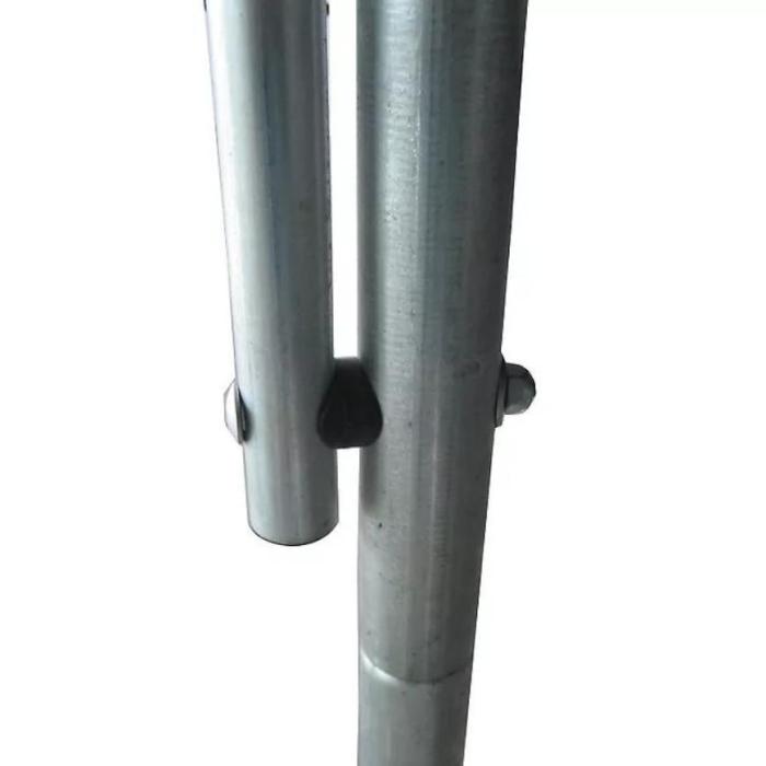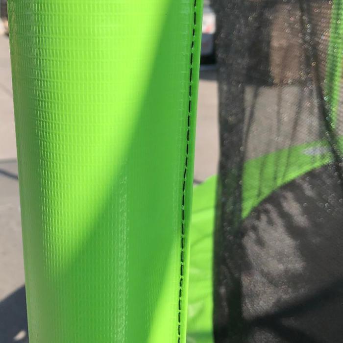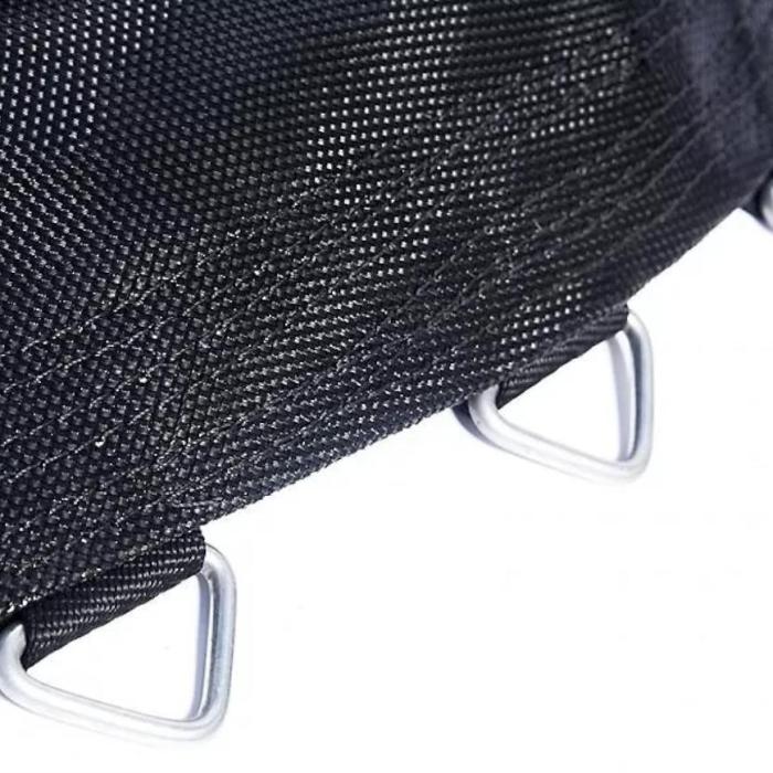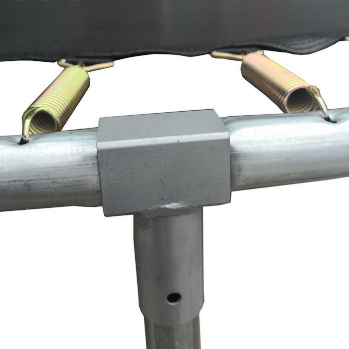 Konstrukcja trampoliny jest bardzo stabilna i wytrzymała - wykonana z dwustronnie ocynkowanych rur stalowych o średnicy 38mm i grubości 1,5mm. Dodatkowo została wzmocniona podwójnymi nóżkami w kształcie litery U. Mata do skakania jest wodoodporna i wytrzymała - została wykonana z polipropylenu. Wejście do trampoliny zamykane jest na zamek - zaleca się zamykanie trampoliny przy każdorazowym korzystaniu z niej. Aby zagwarantować bezpieczeństwo zalca się użycie podczas montażu kotwic mocujących.