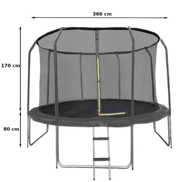 Trampolina o średnicy 366cm to świetny pomysł do sprawienia dzieciom frajdy, jest to idealna motywacja dla nas do spędzenia aktywnie wolnego czasu. Trampolina przeznaczona jest dla dorosłych oraz dla dzieci, ważne jednak by obciążenie nie przekraczało 150kg.