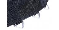 Konstrukcja trampoliny jest bardzo stabilna i wytrzymała - wykonana z dwustronnie ocynkowanych rur stalowych o średnicy 38mm i grubości 1,5mm. Dodatkowo została wzmocniona podwójnymi nóżkami w kształcie litery U. Mata do skakania jest wodoodporna i wytrzymała - została wykonana z polipropylenu. Wejście do trampoliny zamykane jest na zamek - zaleca się zamykanie trampoliny przy każdorazowym korzystaniu z niej. Aby zagwarantować bezpieczeństwo zalca się użycie podczas montażu kotwic mocujących.