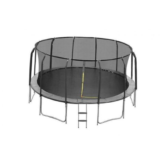 Konstrukcja trampoliny jest bardzo stabilna i wytrzymała - wykonana z dwustronnie ocynkowanych rur stalowych o średnicy 38mm i grubości 1,5mm. Dodatkowo została wzmocniona podwójnymi nóżkami w kształcie litery U. Mata do skakania jest wodoodporna i wytrzymała - została wykonana z polipropylenu. Wejście do trampoliny zamykane jest na zamek - zaleca się zamykanie trampoliny przy każdorazowym korzystaniu z niej. Aby zagwarantować bezpieczeństwo zalca się użycie podczas montażu kotwic mocujących.