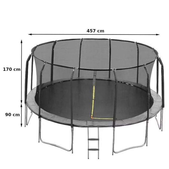 Trampolina o średnicy 457cm to świetny pomysł do sprawienia dzieciom frajdy, jest to idealna motywacja dla nas do spędzenia aktywnie wolnego czasu. Trampolina przeznaczona jest dla dorosłych oraz dla dzieci, ważne jednak by obciążenie nie przekraczało 150kg.