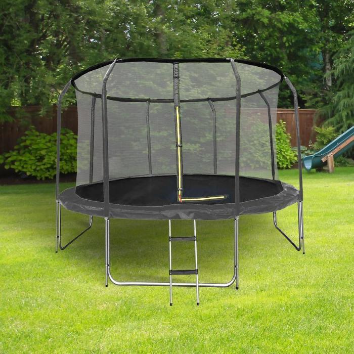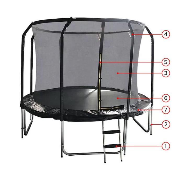 drabinka, metalowe nogi - podwójne, w kształcie litery U, siatka bezpieczeństwa, nakładki na metalowe słupki, wejście zamykane na zamek błyskawiczny, mata do skakania, osłona sprężyn wypełniona pianką