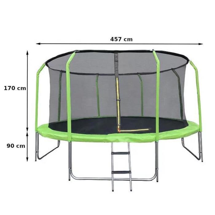 Trampolina o średnicy 457cm to świetny pomysł do sprawienia dzieciom frajdy, jest to idealna motywacja dla nas do spędzenia aktywnie wolnego czasu. Trampolina przeznaczona jest dla dorosłych oraz dla dzieci, ważne jednak by obciążenie nie przekraczało 150kg.