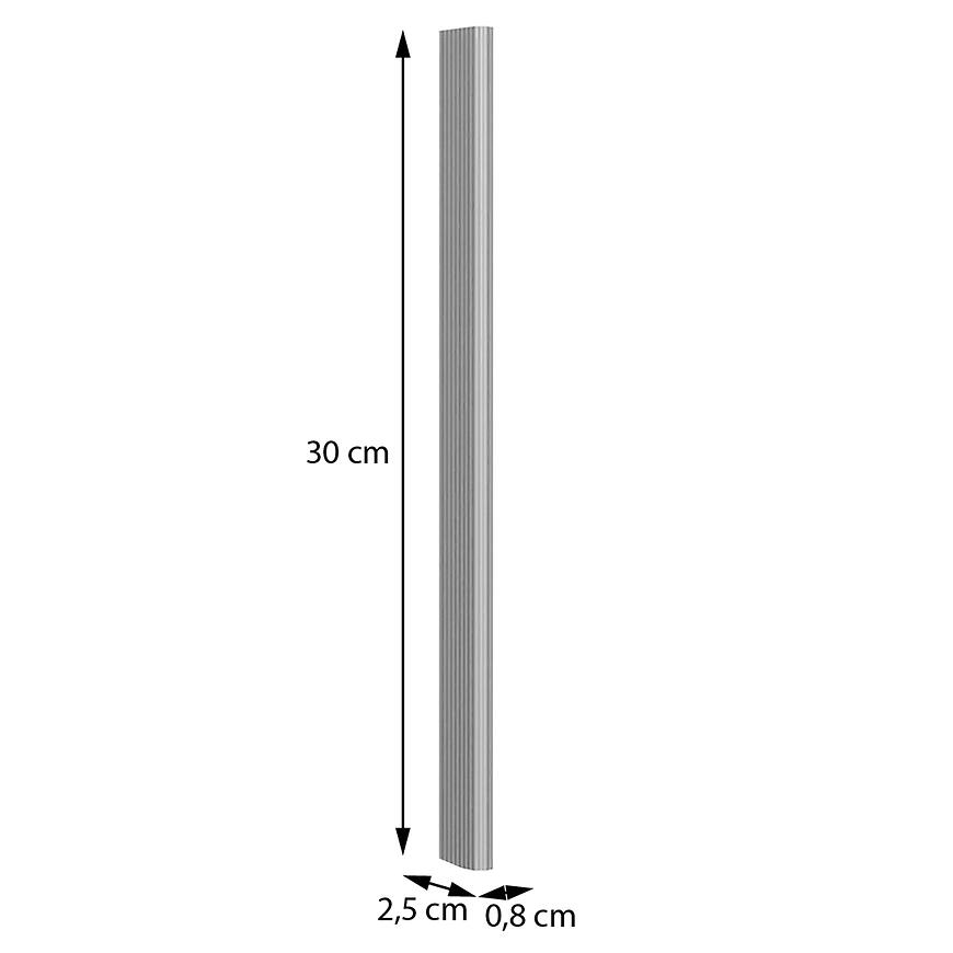Uchwyt ma 0,8 cm szerokości, 30 cm wysokości i 2,5 cm głębokości, zapewniając wygodne użytkowanie i estetyczne wykończenie frontów szaf. Wykonany z płyty wiórowej laminowanej, łączy lekkość z trwałością, a waga 0,2 kg ułatwia montaż.