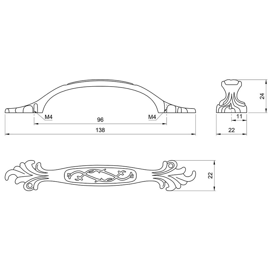 Stylowy uchwyt meblowy Retro UR022-96 w kolorze patyna mosiądz to elegancki detal, który wzbogaci wygląd szafek i szuflad. Wykonany z trwałego materiału, zapewnia wytrzymałość i komfort użytkowania. Uchwyt ma długość 138 mm, wysokość 24 mm i szerokość 22 mm, a montaż jest prosty dzięki rozstawowi otworów 96 mm i przykręcanemu sposobowi mocowania. Funkcjonalny i dekoracyjny, doskonale łączy estetykę z praktycznością.