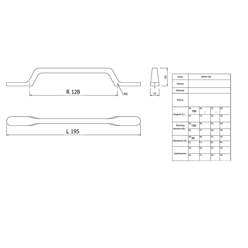 Nowoczesny uchwyt meblowy U098-128 w kolorze czarny mat to elegancki dodatek do szafek i szuflad, który wprowadza nowoczesny, minimalistyczny styl. Wykonany z trwałego materiału ZnAl, zapewnia wytrzymałość i komfort użytkowania. Uchwyt ma szerokość 195 mm i wysokość 26 mm, a montaż jest prosty dzięki przykręcanemu sposobowi mocowania. Funkcjonalny i dekoracyjny, doskonale łączy estetykę z praktycznym zastosowaniem w każdym wnętrzu.