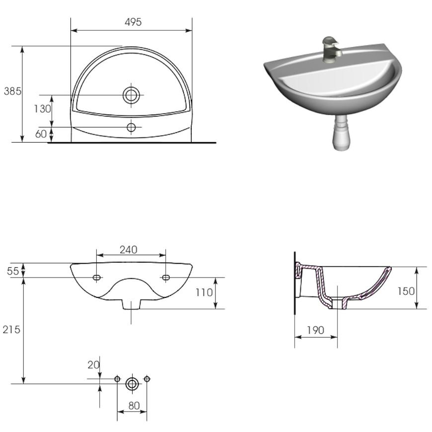 Umywalka ceramiczna Mito 55 1/O z otworem na baterię.