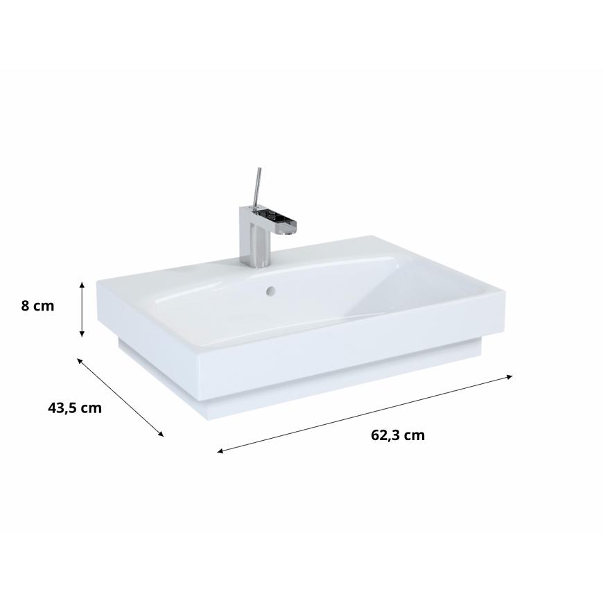 Umywalka Cetina charakteryzuje się wyjątkowymi wymiarami, jej szerokość wynosi 62,3 cm, wysokość 8 cm, a głębokość 43,5 cm, co czyni ją odpowiednią zarówno do mniejszych, jak i większych łazienek.