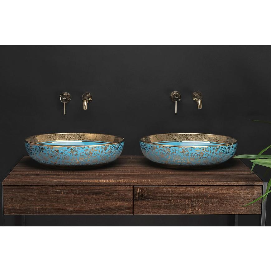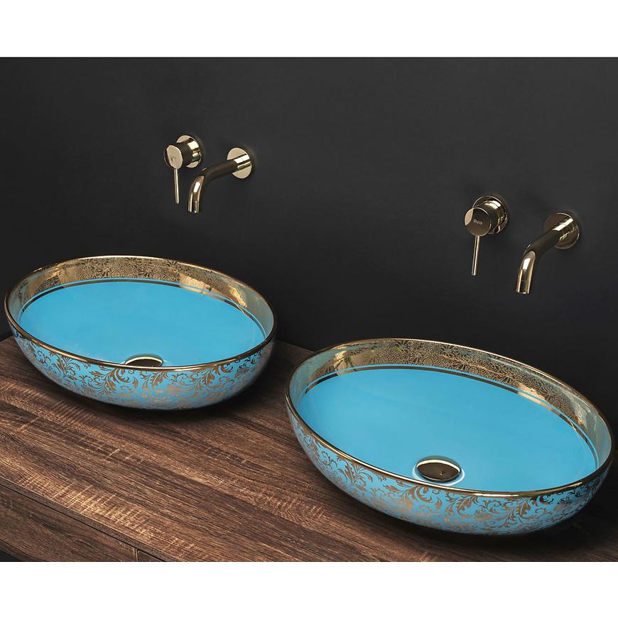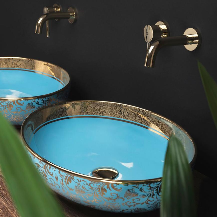 Kolor niebieski z złotymi zdobieniami nadaje umywalce wyjątkowego i ekskluzywnego wyglądu. To połączenie delikatności niebieskiego odcienia z subtelnymi złotymi zdobieniami tworzy elegancki kontrast, który odzwierciedla luksusowy styl.
