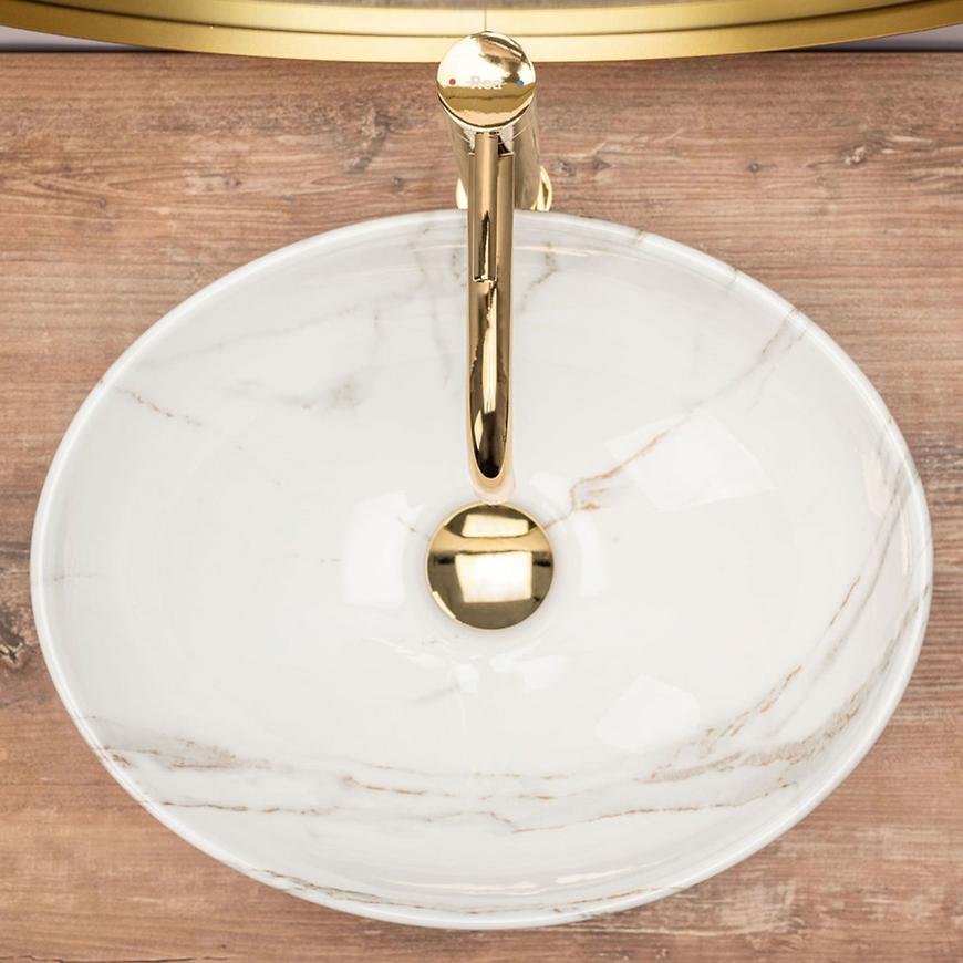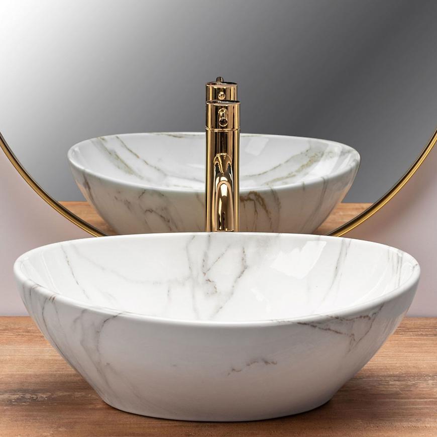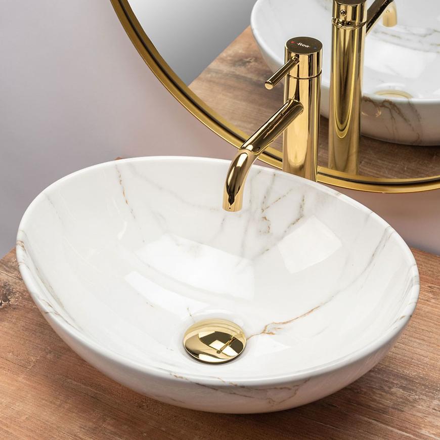 Umywalka nablatowa Sofia Aiax Shiny REA – elegancka umywalka w kolorze marmuru, wykonana z trwałej ceramiki. Jej wymiary to 41x34,5 cm, wysokość 15 cm, waga 6,5 kg. Model nablatowy, bez otworu na baterię i bez przelewu, idealny do nowoczesnych aranżacji łazienki. Stylowe wykończenie i solidne wykonanie gwarantują funkcjonalność i wyjątkowy wygląd.