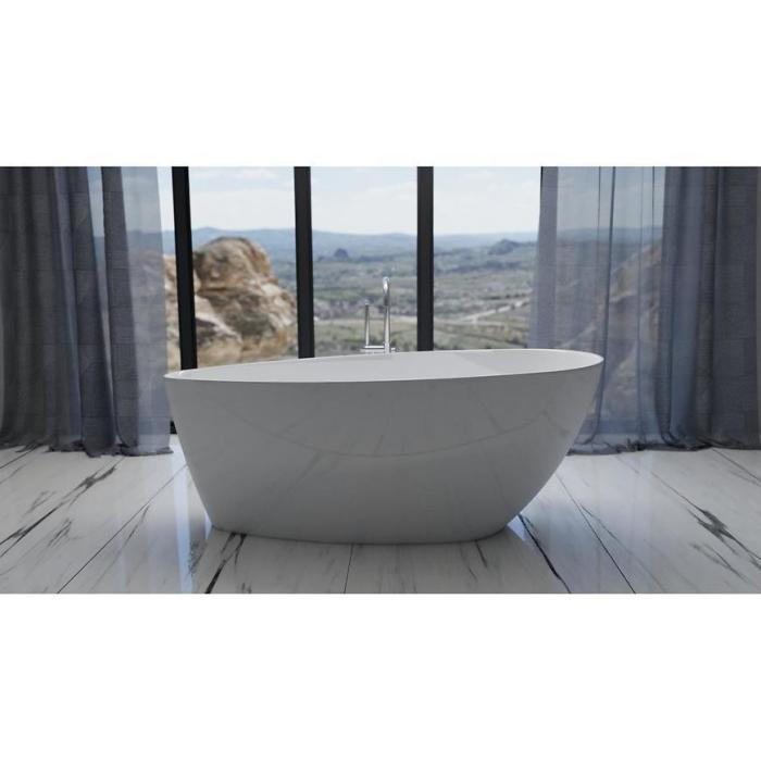 Wanna wolnostojąca Xenia w kolorze białym, materiał wykonania to konglomerat. Średnica syfonu wynosi 5,2 cm. Pasujące syfony to: