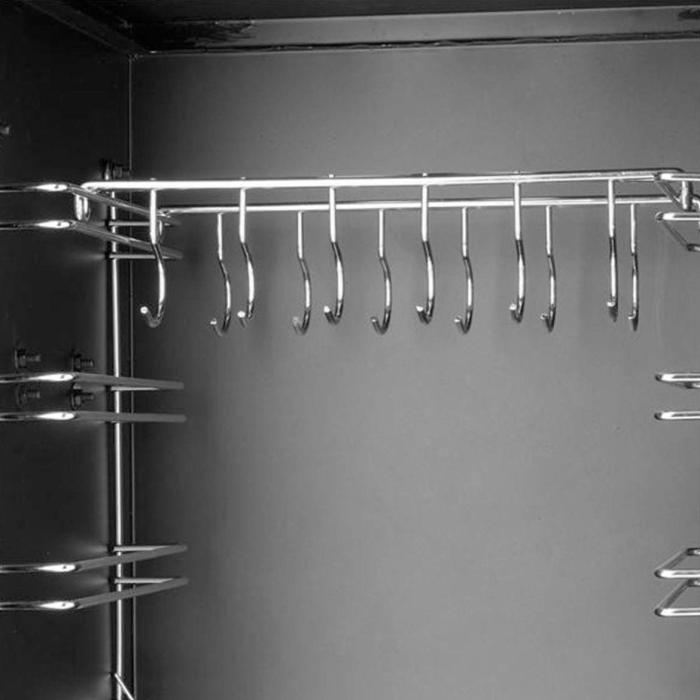W zestawie znajdują się chromowane wieszaki na ryby (każdy z 6 hakami), wbudowany termometr i trzy przesłony wentylacyjne do precyzyjnej kontroli temperatury.