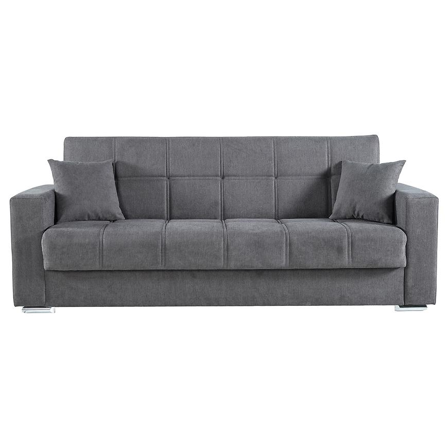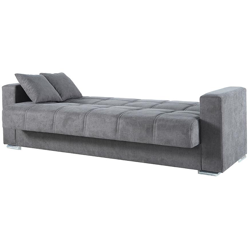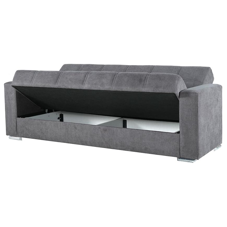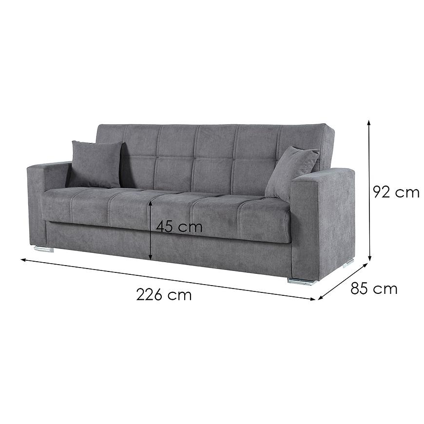Na praktyczne zalety wersalki z pewnością zwrócą uwagę miłośnicy funkcjonalnych rozwiązań. Mebel ten posiada funkcję spania oraz dodatkowe miejsce do przechowywania na przykład pościeli. Po rozłożeniu powierzchnia spania wynosi 190x110 cm. Zastosowany wersalkowy system rozkładania sprawia, że jest to szybkie i proste. Wypełnienie wersalki stanowi sprężyna, która zapewnia komfortowy wypoczynek. Całość osadzona jest na stabilnych, niskich nóżkach w kolorze srebrnym, które dodatkowo pełnią funkcję dekoracyjną.