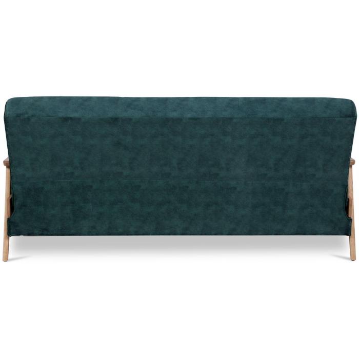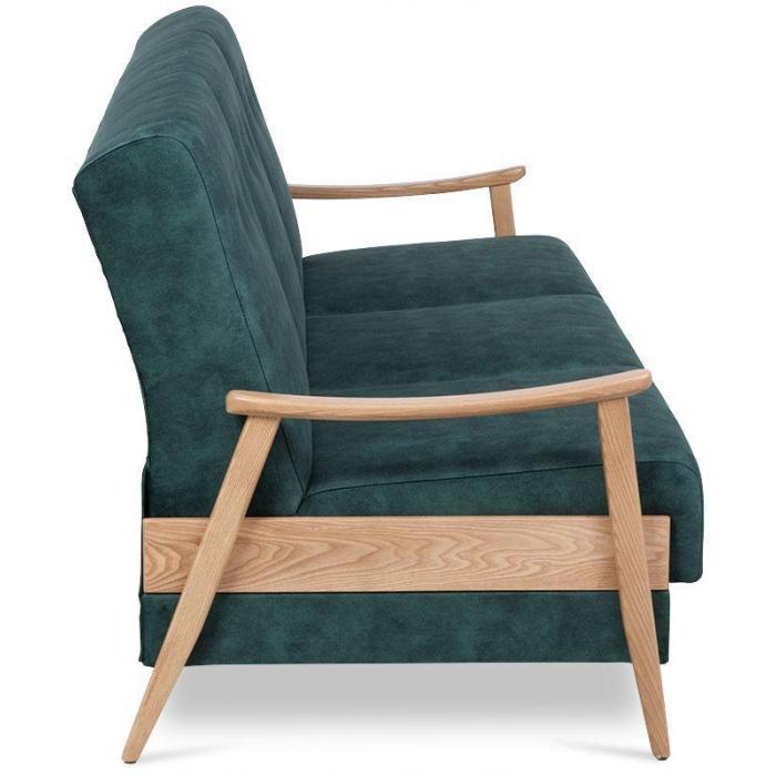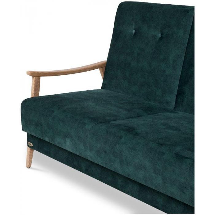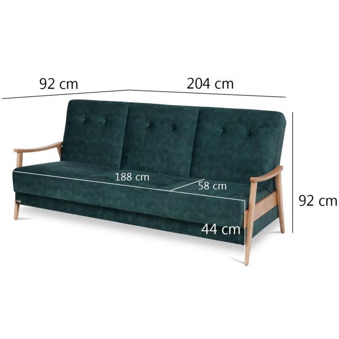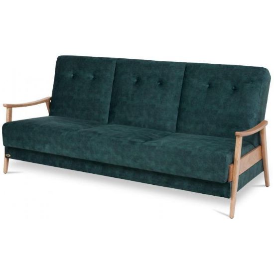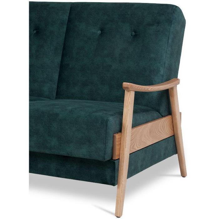 Wersalka jest bardzo stylowa, z pewnością wpisze się w nowoczesne wnętrza, które zyskają ciekawego charakteru. Drewniane elementy nie tylko stabilizują mebel, ale pod względem wizualnym świetnie się prezentują. Obicie wersalki stanowi ciemnozielona tkanina. Sofa Bondi nie tylko spełni się w roli wygodnej kanapy, na której możesz zasiąść przed telewizorem, ale także pożądanej funkcji spania, która zmienia salon w dodatkową sypialnię.