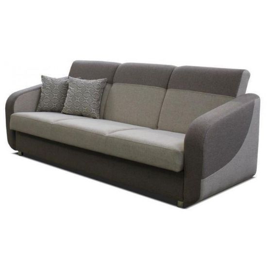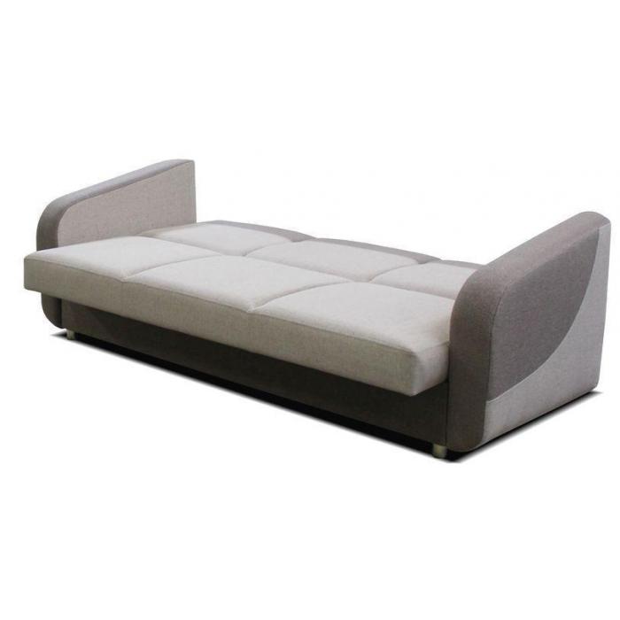 Trzyosobowa wersalka Desso stanowi interesujące połączenie nietuzinkowego designu oraz wysokiej użyteczności. Tapicerkę wykonano w spokojnych odcieniach jasnego beżu oraz szarości, dlatego będzie ona prezentowała się doskonale nawet wśród odważnych, jaskrawych barw. Desso wersalka pozwala się rozłożyć tak, aby pełniła funkcję wygodnego łóżka o wymiarach 122x190 cm, a do schowania pościeli posłuży przestronny pojemnik. W siedzisku oraz oparciu zamontowano sprężyny faliste, które charakteryzują się wytrzymałością i elastycznością, co wpływa na większy komfort wypoczynku. Wersalka Desso Abra sprzedawana jest w komplecie z dwoma pięknymi poduszkami, udekorowanymi geometrycznym wzorem. Jest to ciekawy mebel, który dzięki opływowym kształtom oraz uniwersalnym kolorom, ozdobi wiele różnorodnych wnętrz.