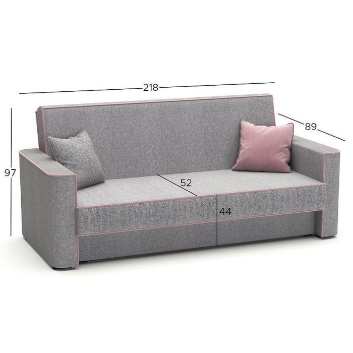 Po rozłożeniu kanapy otrzymujemy optymalną dla dwóch osób powierzchnię o wymiarach 116x190 cm. Dodatkowy pojemnik na pościel to bardzo praktyczne rozwiązanie zwłaszcza do małego mieszkania. Zastosowany sposób wspomagający rozkładanie to automat wersalkowy.