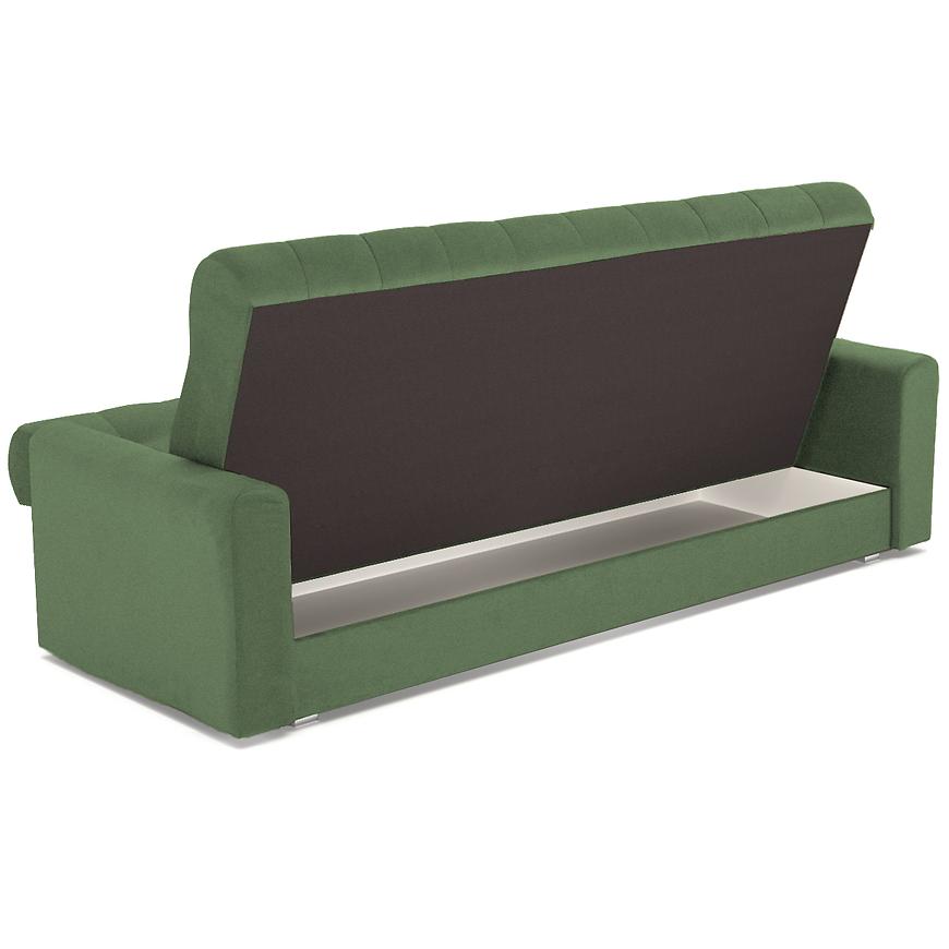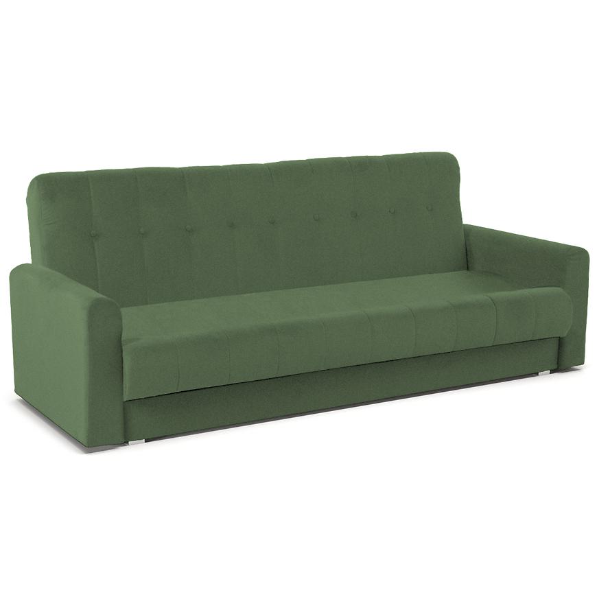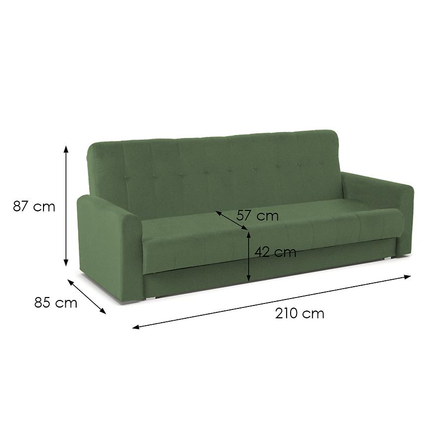 Wersalka Marcin Herbi 10 zielona to komfortowa sofa z funkcją spania o wymiarach 210×85×87 cm. Tapicerowana zieloną tkaniną, z siedziskiem wypełnionym sprężyną falistą, o wysokości 42 cm i głębokości 57 cm. Funkcja spania zapewnia powierzchnię 115×190 cm, a automat wersalkowy umożliwia szybkie i łatwe rozkładanie. Wersalka posiada jeden schowek na pościel, chromowane nogi i wymaga złożenia. Produkt nie zawiera poduszek ani regulowanych elementów, co daje prosty, nowoczesny wygląd i wygodę codziennego użytkowania.