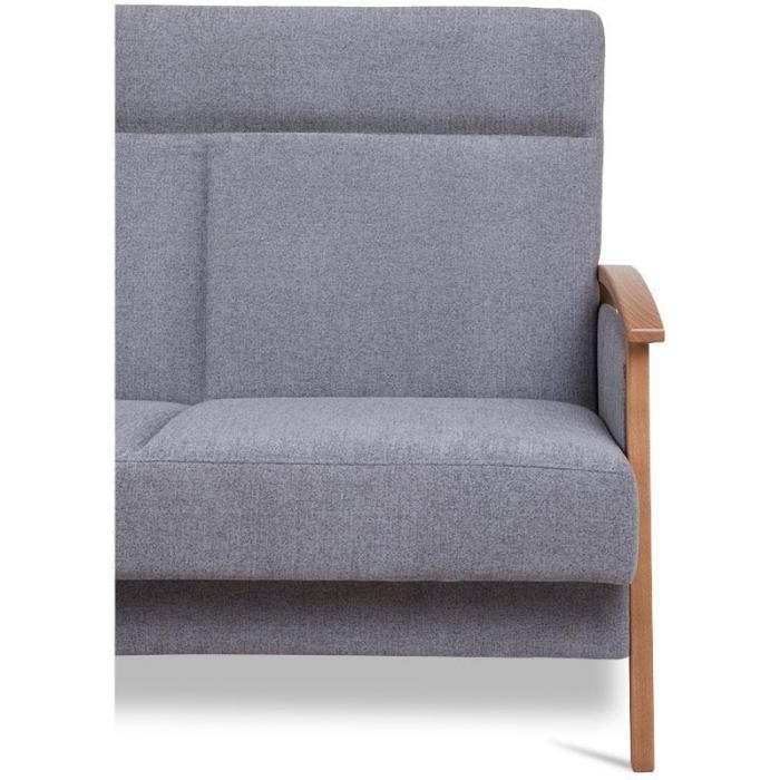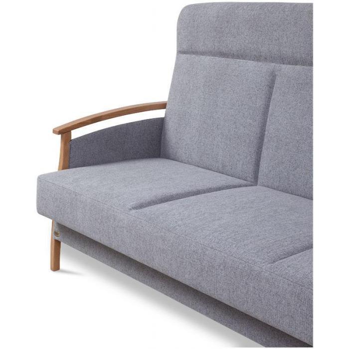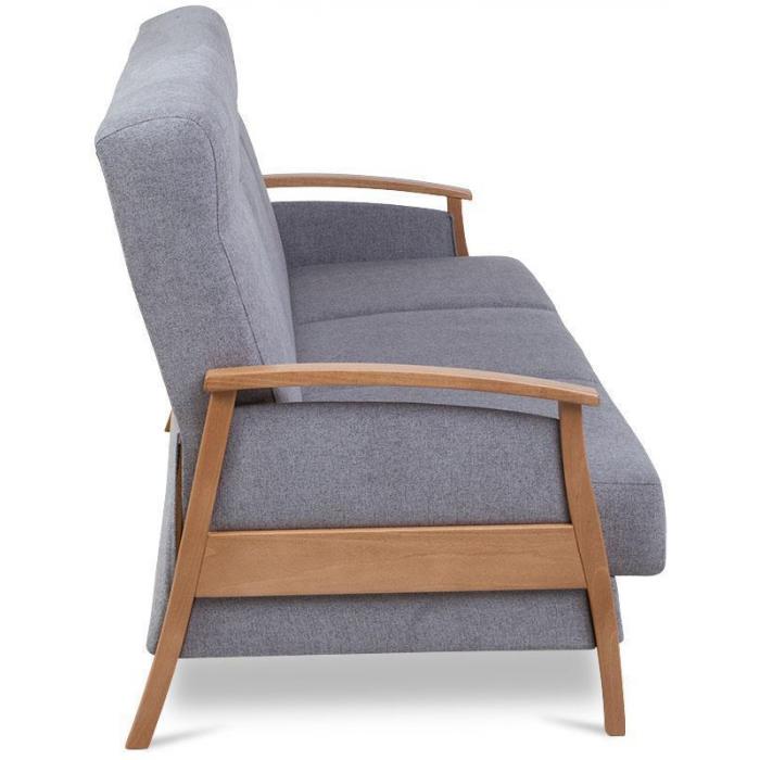 Klasyczna wersalka Milo w nowoczesnym wydaniu, dostępna w kolorze popielatym z ozdobnymi przeszyciami na oparciu i siedzisku. Poręcze wykonane są z najwyższej jakości drewna bukowego w kolorze jesion, co wpływa na solidność i wytrzymałość całej konstrukcji.