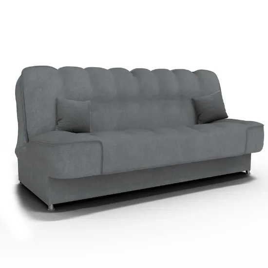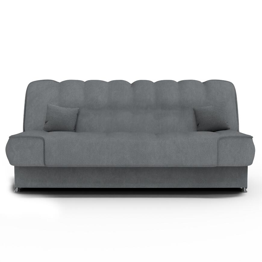 Tapicerka z tkaniny w kolorze szarym jest przyjemna w dotyku i odpowiednia do intensywnego użytkowania. W komplecie znajdują się poduszki, które zwiększają wygodę i uzupełniają wygląd mebla. Wersalka została osadzona na plastikowych nogach, które zapewniają stabilność oraz ułatwiają utrzymanie czystości pod meblem.