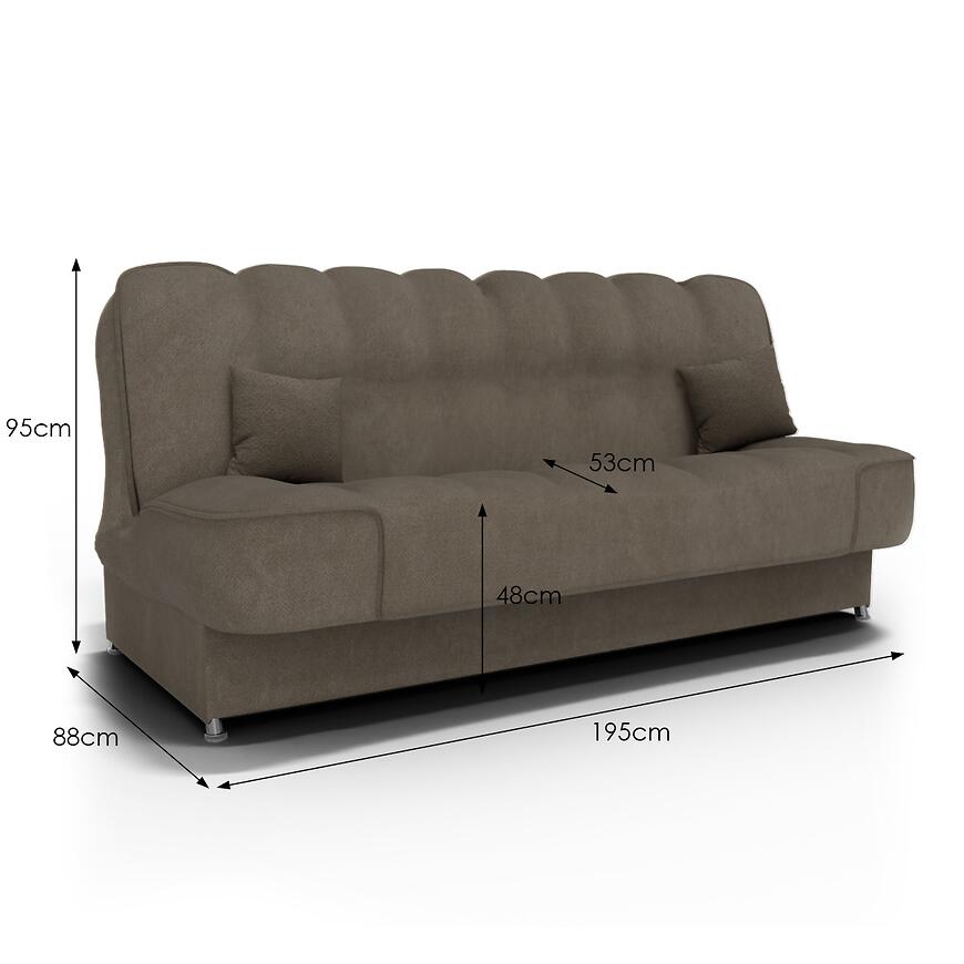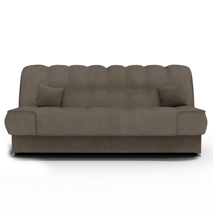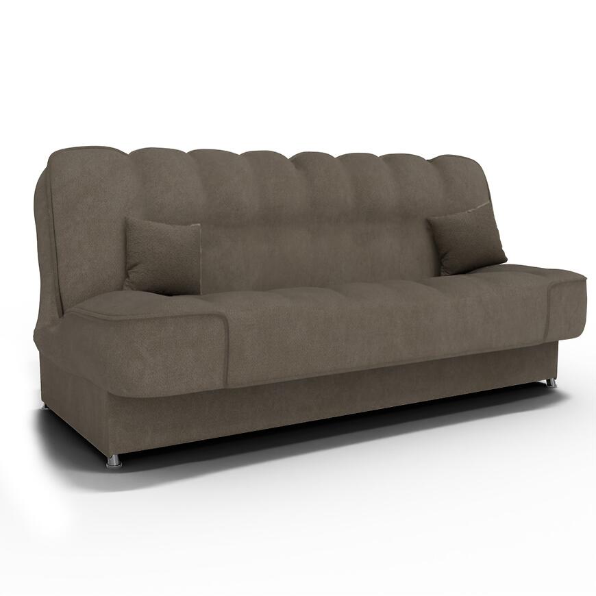 Tapicerka z tkaniny w kolorze brązowym jest przyjemna w dotyku i dobrze sprawdza się w codziennym użytkowaniu. W zestawie znajdują się poduszki, które zwiększają wygodę i dopełniają wygląd mebla. Wersalka stoi na plastikowych nogach, które zapewniają stabilność oraz ułatwiają sprzątanie pod meblem.