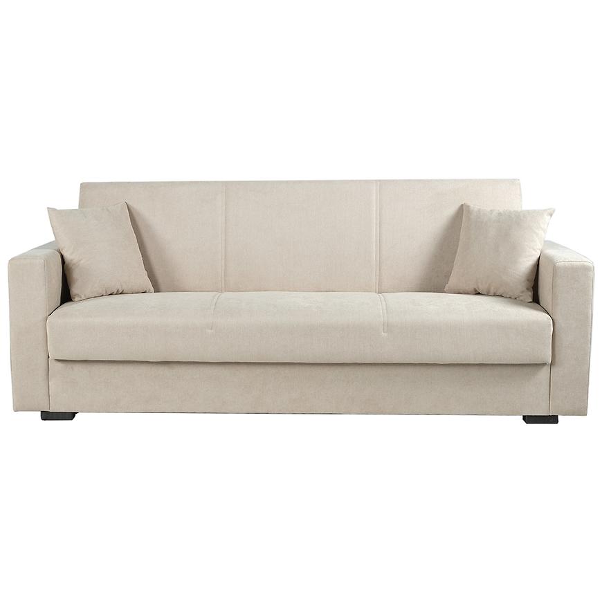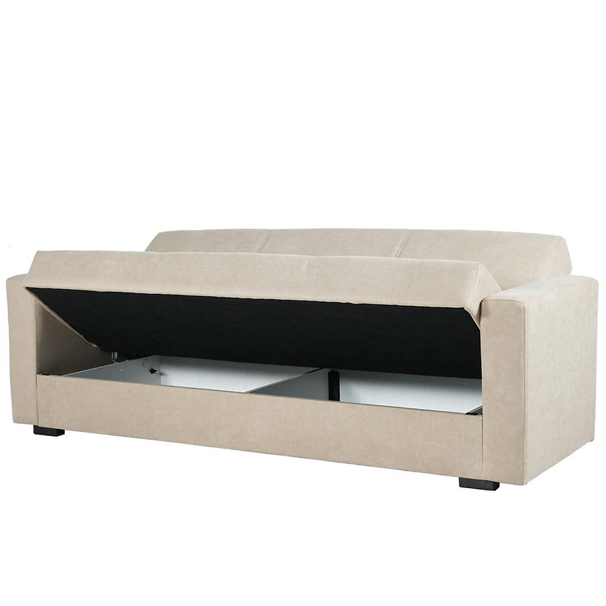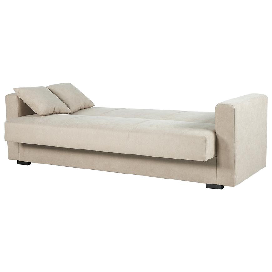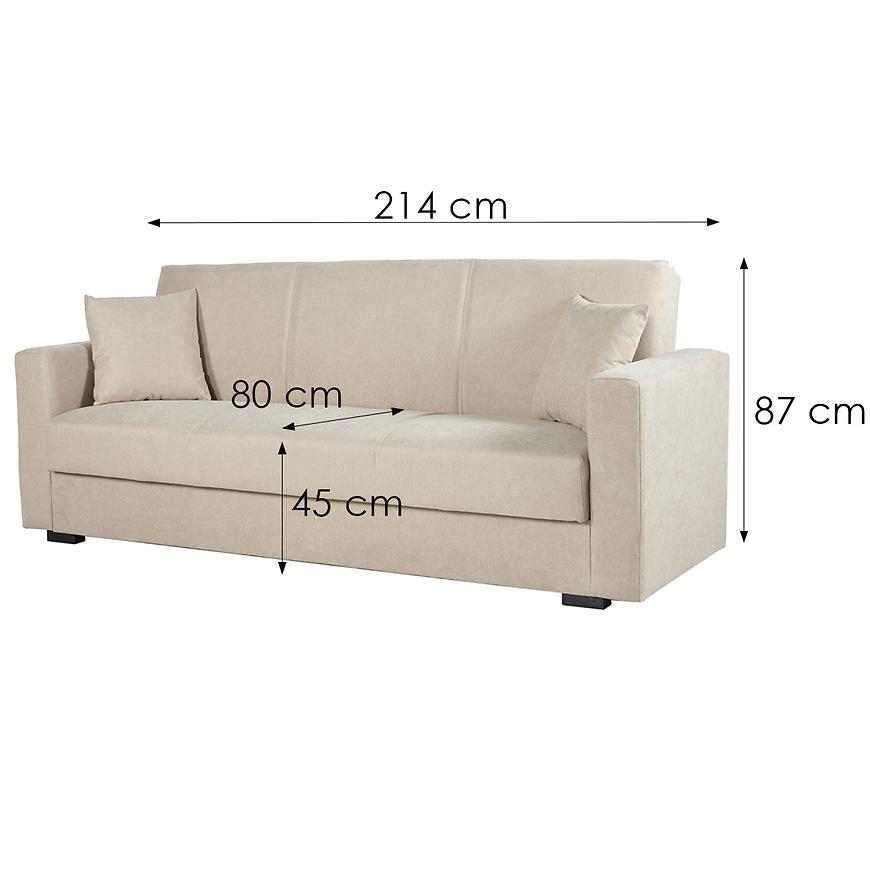 Wersalka Promo Bacos 02 to praktyczny mebel w beżowej tkaninie, łączący funkcję komfortowego siedzenia i spania. Wyposażona w sprężynę bonell, zapewnia wygodę codziennego użytkowania, a mechanizm wersalkowy umożliwia szybkie rozłożenie do powierzchni spania 184x103 cm. Model posiada schowek na pościel, stabilne czarne nogi oraz poduszki w komplecie, podkreślające wygodę i styl. Wymiary: szer. 214 cm, gł. 80 cm, wys. 87 cm, wys. siedziska 45 cm. Wymaga złożenia.