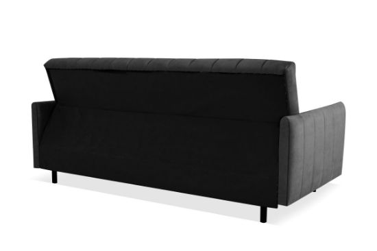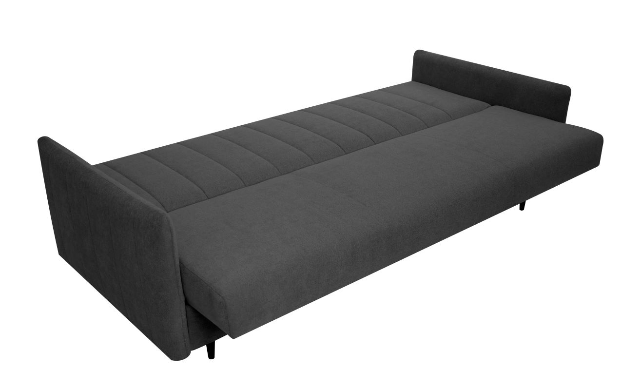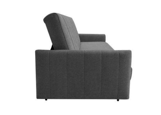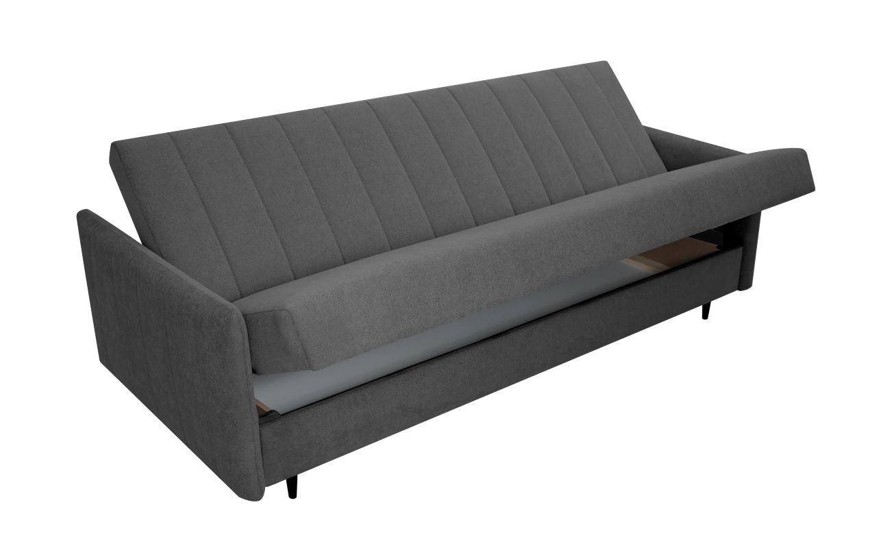Sposób rozkładania wersalki to typ "Clic-Clac", co oznacza prostotę i łatwość obsługi. Po rozłożeniu uzyskujemy przestronną powierzchnię spania o wymiarach 121x201 cm, co sprawia, że wersalka Ellen jest idealna nawet dla dwóch dorosłych osób. Funkcja spania jest uzupełniona pojemnikiem na pościel, co zwiększa praktyczność mebla i pozwala na sprytne przechowywanie dodatkowych akcesoriów.