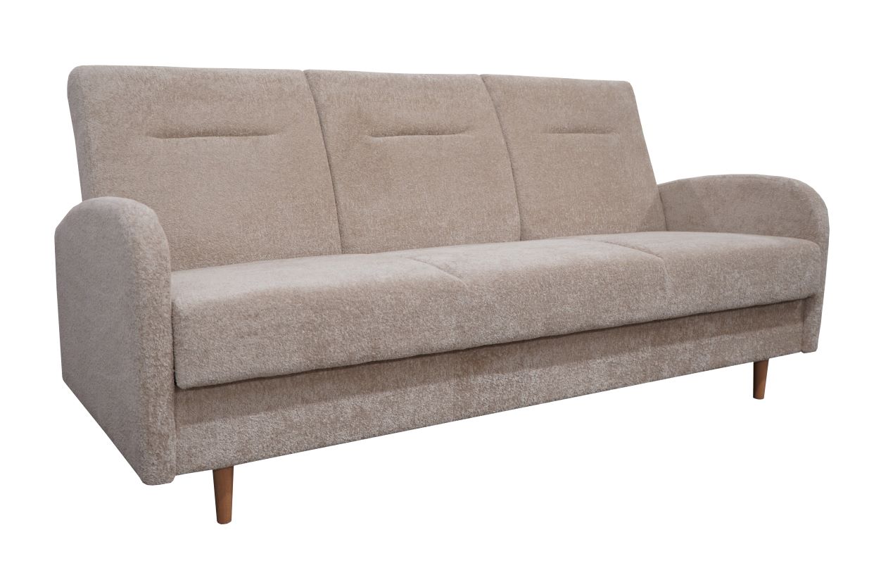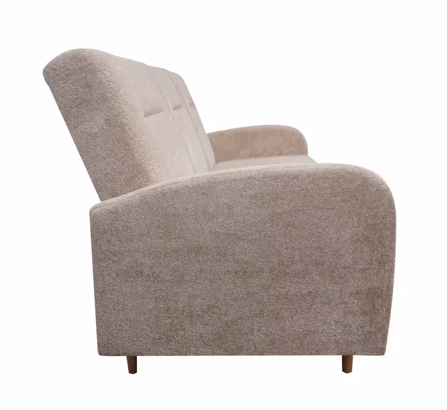 Wersalka rozkładana z pojemnikiem Fibi w kolorze beżowym to propozycja dla osób, które chcą wprowadzić do wnętrza harmonię, komfort i subtelną elegancję. Model wyróżnia się starannie zaprojektowaną formą: wyraźnie zarysowane boki, wysokie drewniane nóżki oraz dekoracyjne przeszycia i wciągi podkreślają współczesny charakter mebla. Neutralna kolorystyka beżowa sprawia, że wersalka Fibi świetnie komponuje się zarówno z jasnymi, jak i ciemniejszymi dodatkami, dzięki czemu łatwo dopasować ją do wystroju salonu, pokoju dziennego czy przestrzeni gościnnej.