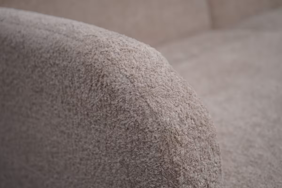 Wersalka Fibi została wykonana w tkaninie Prime, należącej do grupy materiałów typu boucle. To tkanina, która w ostatnich latach zyskała ogromną popularność – jej miękka, pętelkowa struktura nadaje meblowi ciepły, przytulny charakter, a jednocześnie wpisuje się w aktualne trendy wnętrzarskie. Materiał jest przyjemny w dotyku, gęsty i trwały, co pozytywnie wpływa na komfort i żywotność mebla.