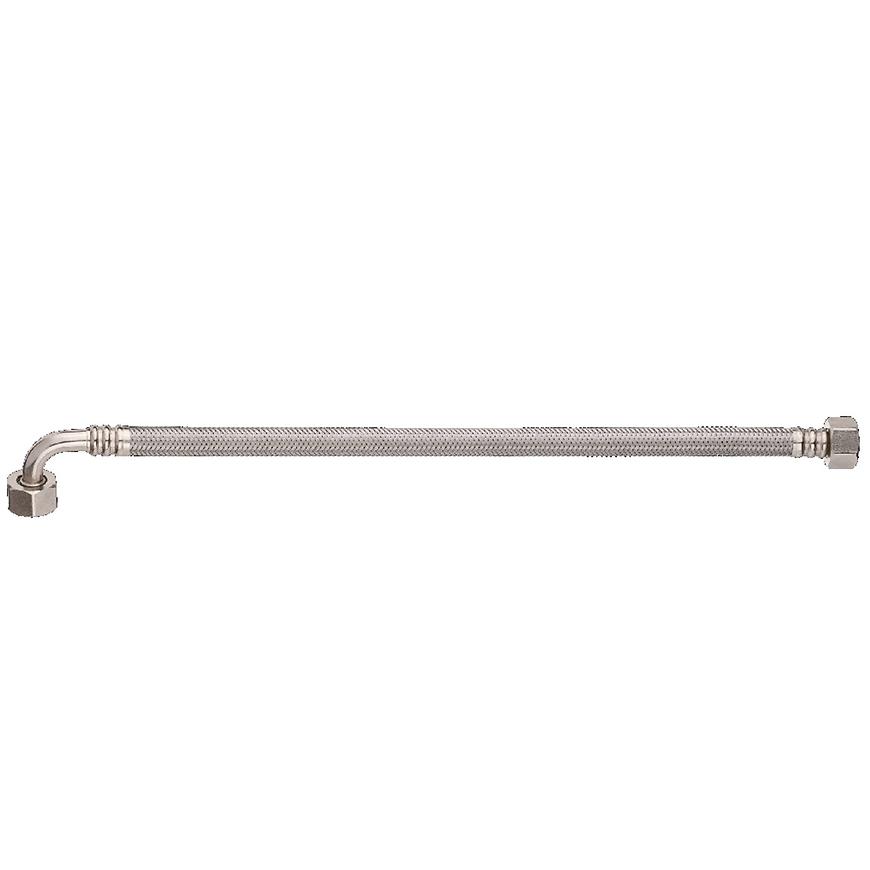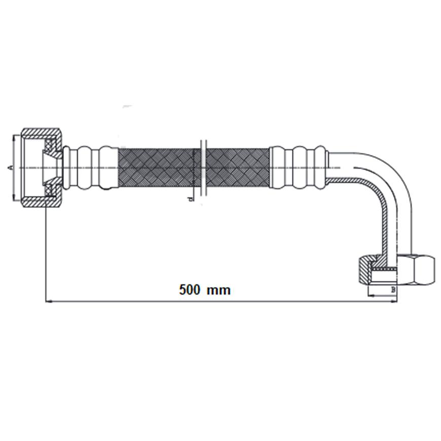 Materiał i konstrukcja: Wężyk wykonany jest z oplocie stalowym ze stali nierdzewnej, co zapewnia trwałość i odporność na korozję. Końcówki węża są gięte pod kątem 90 stopni, co ułatwia instalację w różnych miejscach.