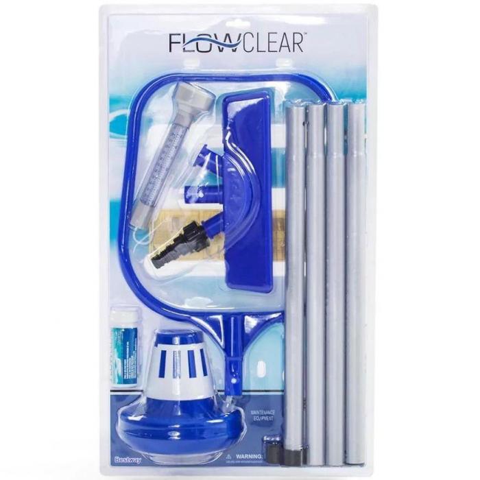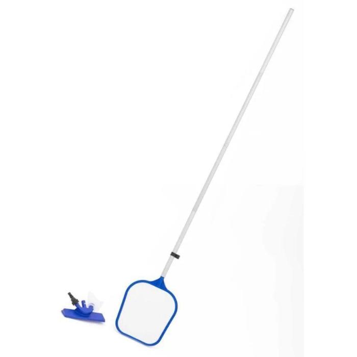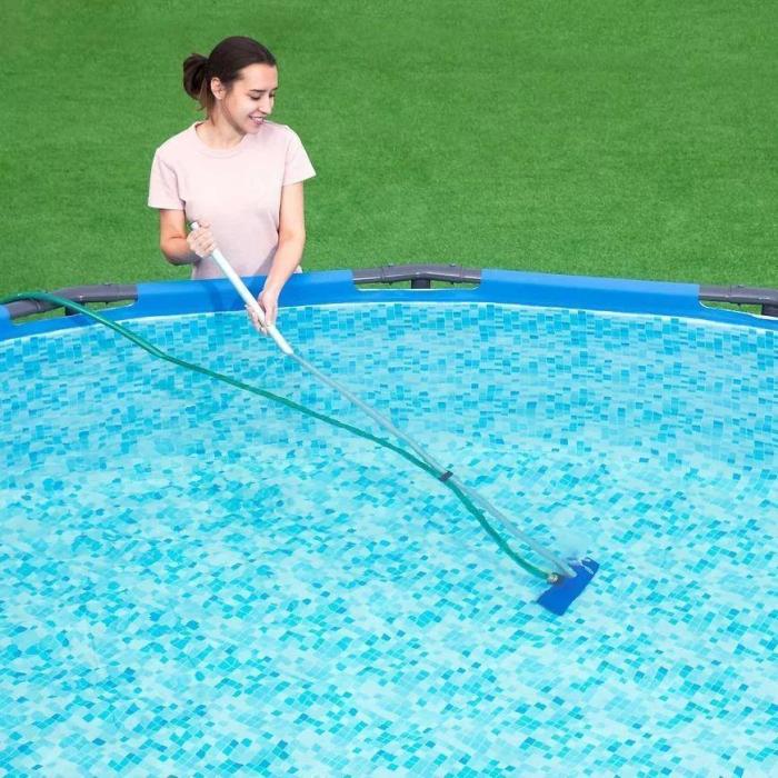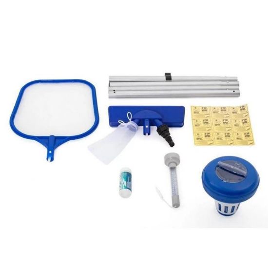 - kijek z wymiennymi końcówkami (odsysająca z workiem na zanieczyszczenia, odgarniająca), łatki naprawcze (9szt.), paski do testowania zawartości chloru, odczynu pH wody w basenie (50 szt.), pływający termometr (pokazuje temperaturę w skali Celsjusza i Fahrenheita), dozownik do chemii.